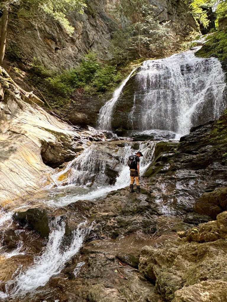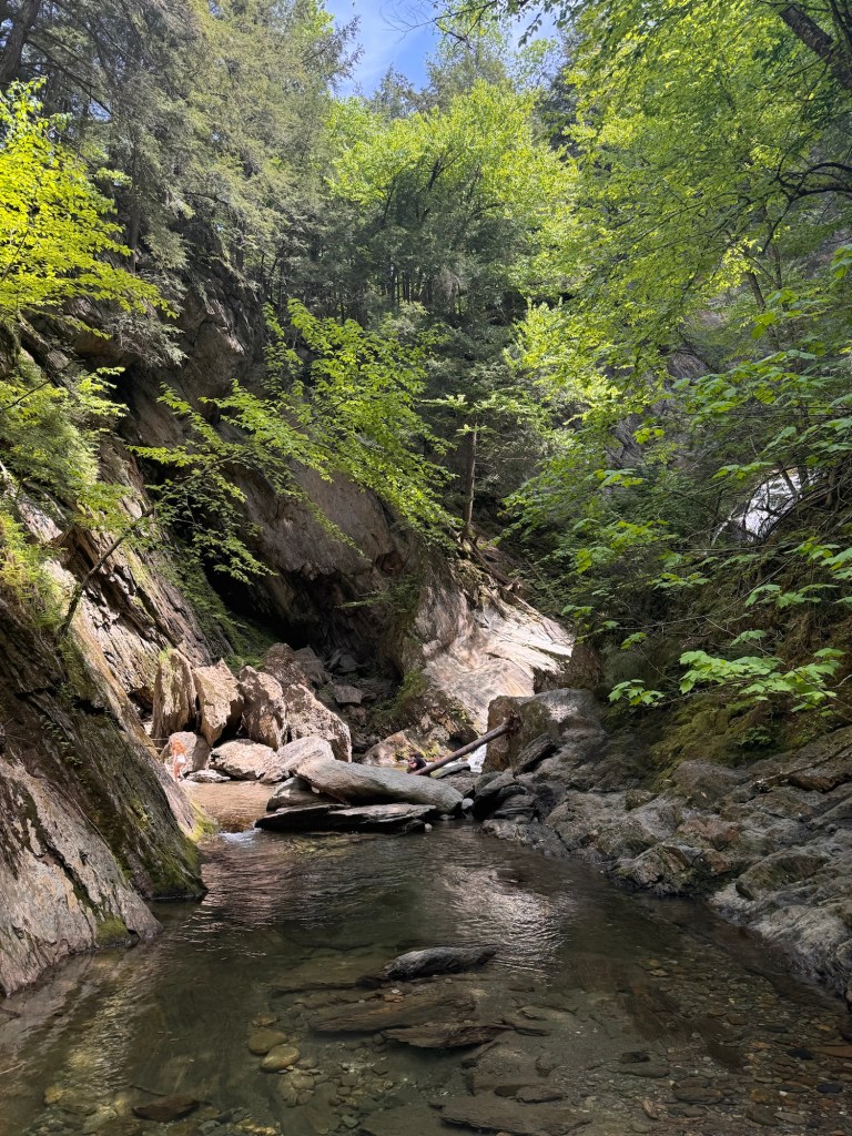 We woke up super early to pack up our entire camp and drove 2.5 hours from Jamaica State Park to Moss Glen Falls. The sign that welcomes you in the parking lot says it’s the C.C. Putnam State Forest – Burt Hollow Block – Moss Glen Falls Natural Area.