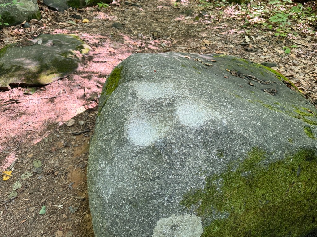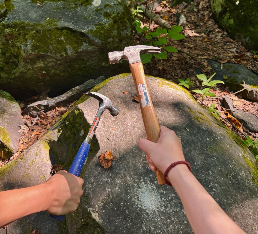 The whole point of coming here is to bang the rocks in the area with a hammer because they make different sounds. There’s a short loop trail you can take to the boulder field, or you can just bee-line it there without doing the trail at all. Those white marks on the boulders are from where everyone has hit them over and over, over time. Isn’t that so cool?