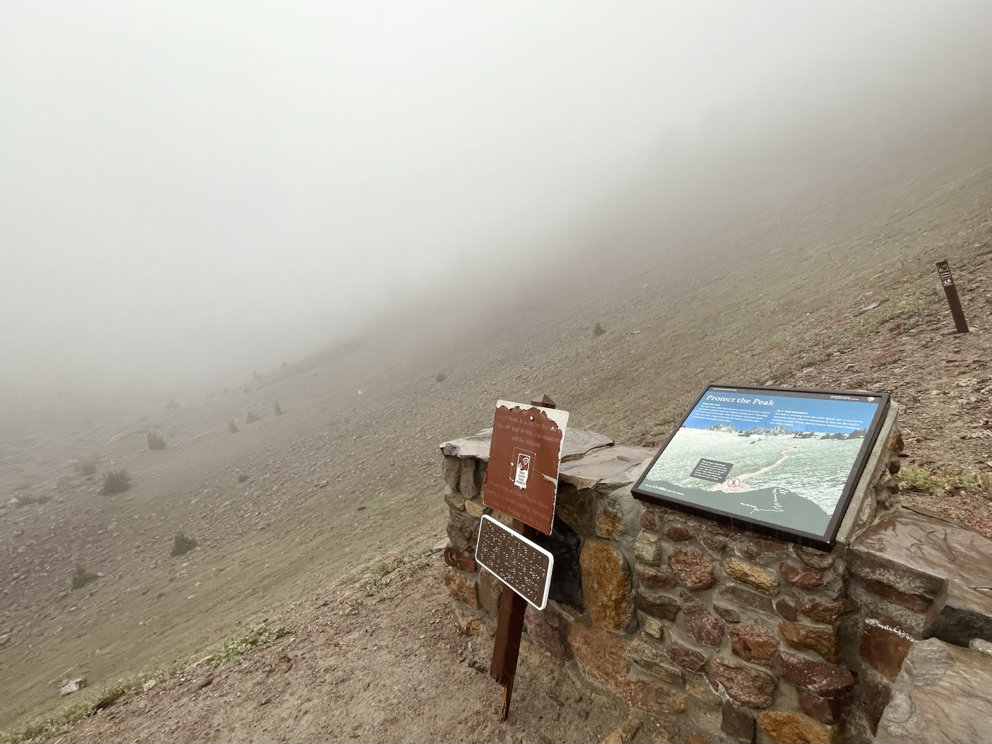 By the time we made the quick walk from the parking lot to the start of the trail, we were soaking wet, couldn’t raise our heads to look ahead of us because of the wind + rain, and couldn’t even see the car anymore because of the fog.