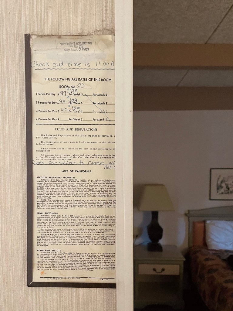 It was the best decision we could have made. Instead of camping in the rain, we ended up at Richardson’s Holliday Inn which was a super cute motel, in their last available room, with a super comfy bed, our first real shower in days, and next to the most delicious and adorable BBQ spot in Tahoe.