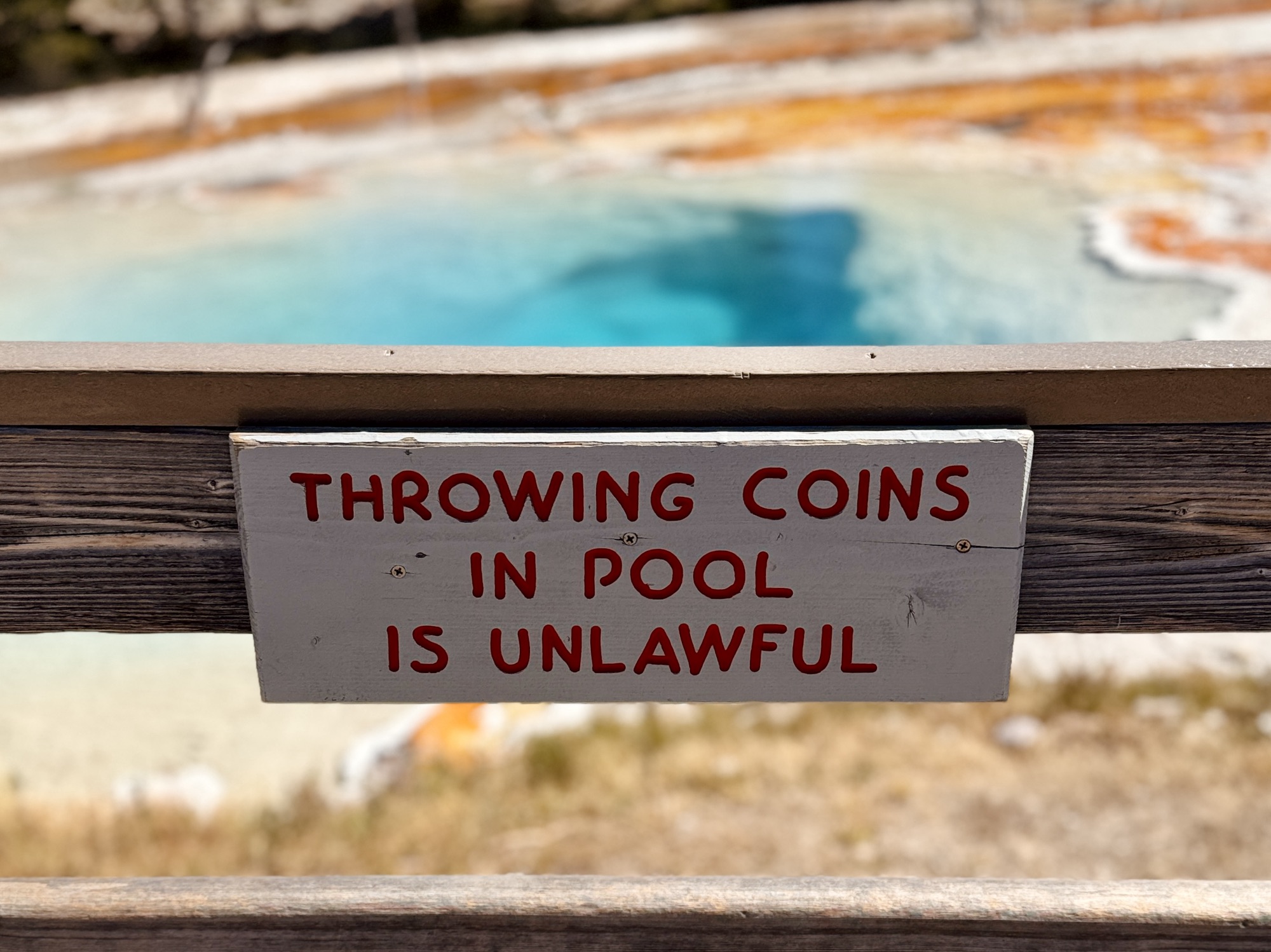 Tourists stupidly throw coins and other junk into these springs (I guess to see what will happen? who knows), then the park has to clear them out. The junk plugs the opening of the hot spring, affecting it’s temperature and just generally screwing the entire ecosystem up. The Morning Glory Pool by Old Faithful is sadly famous for this.