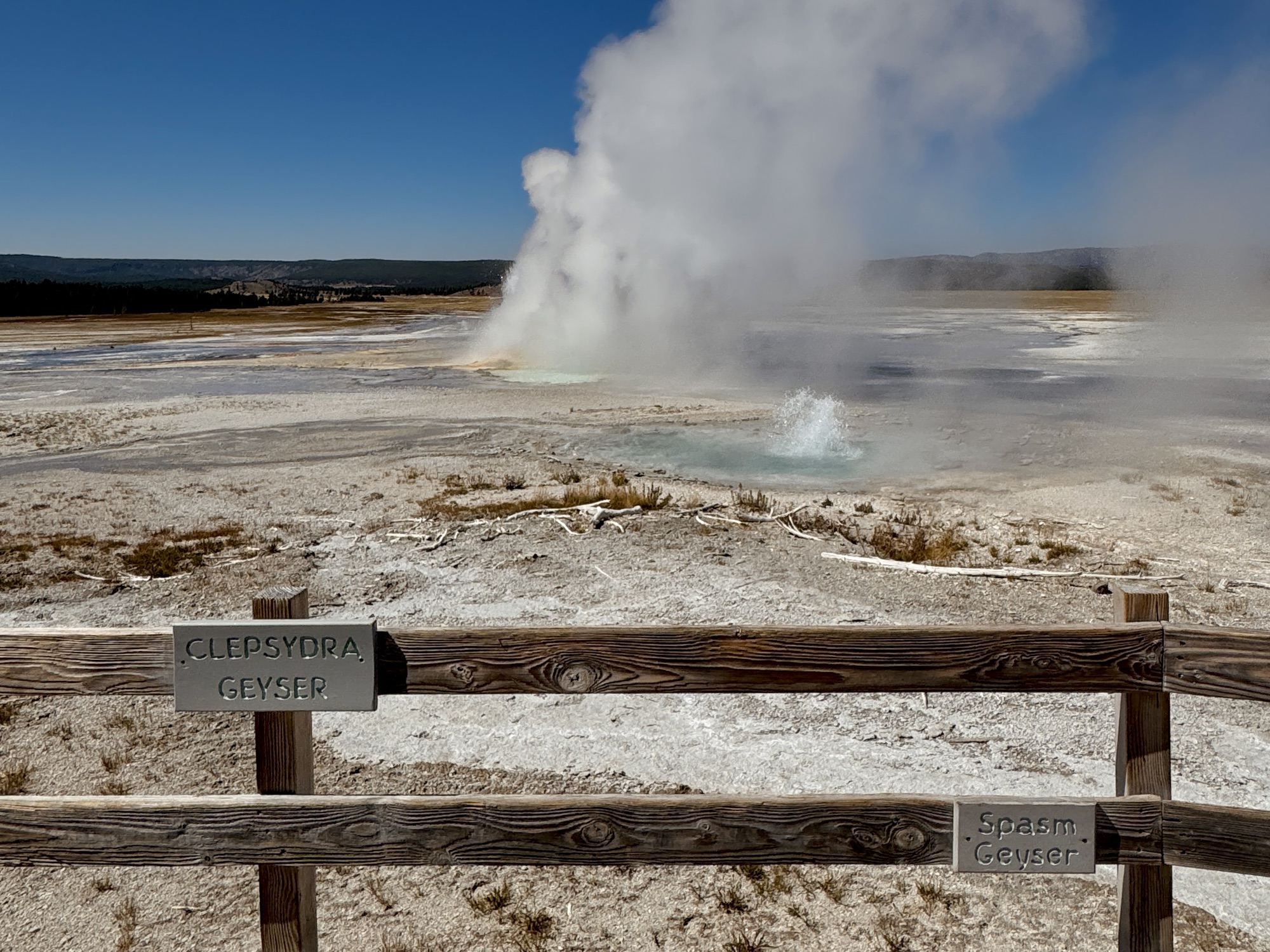 Clepsydra and Spasm Geyser were going off a few feet down the boardwalk from Morning and Fountain, and we too cute pics of each other back and forth. 🙂