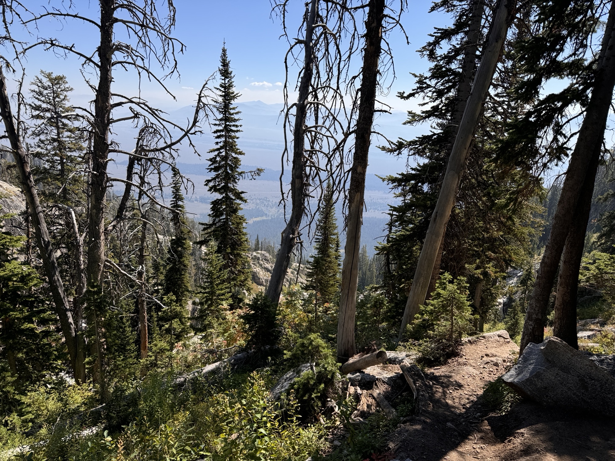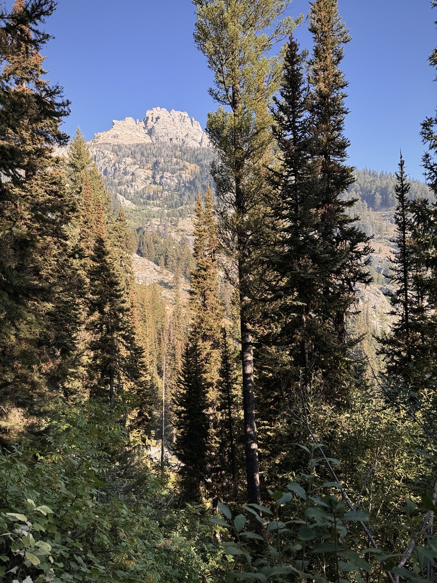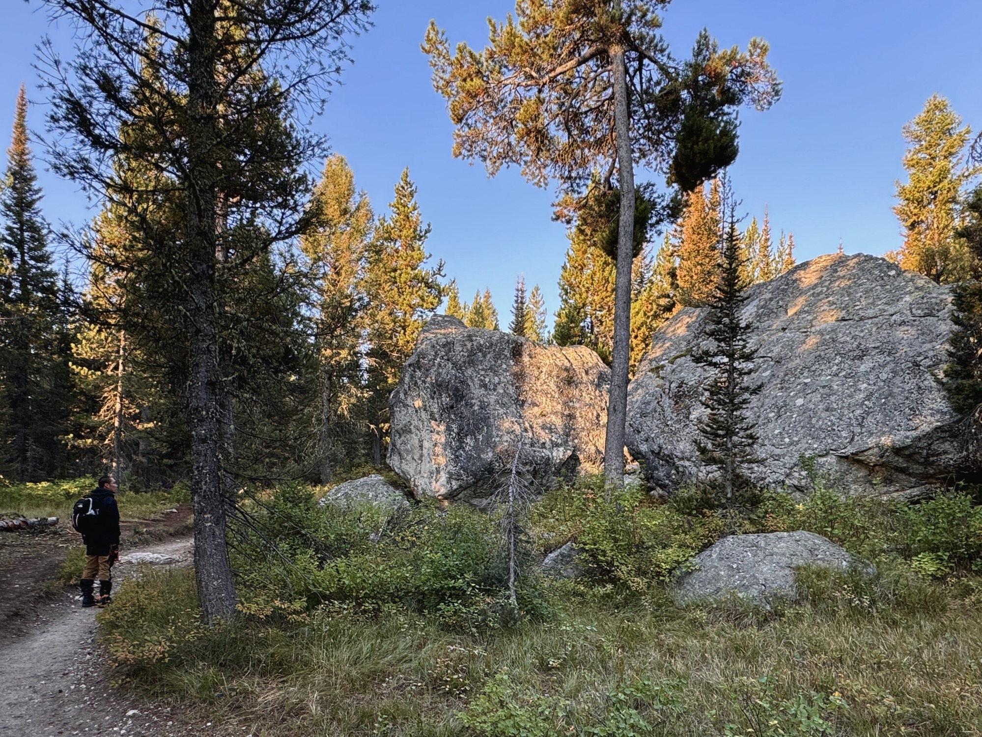 You start by walking through a dense pine forest and around some huuuge glacial boulders. Eventually, the Teton range starts to come into view through the trees.