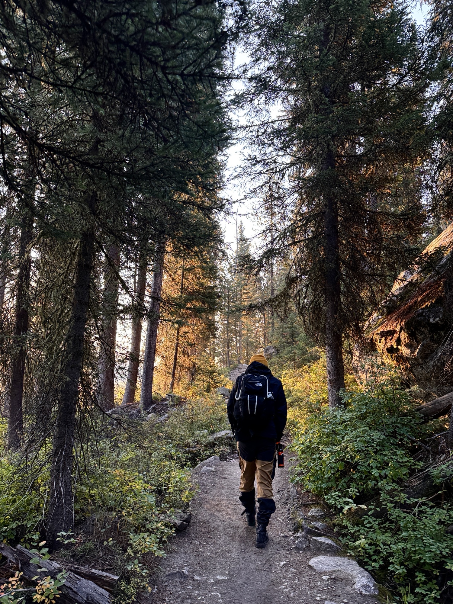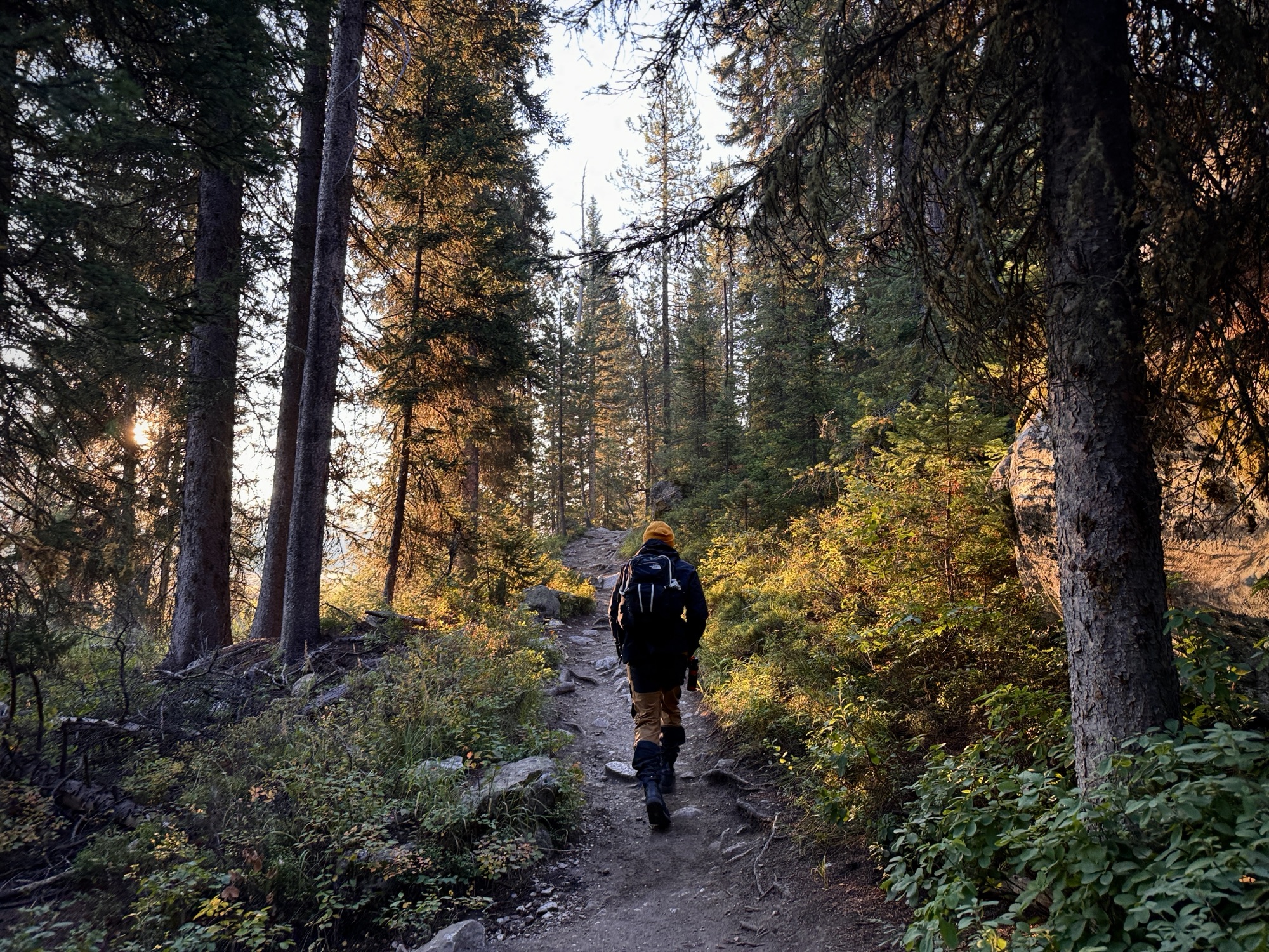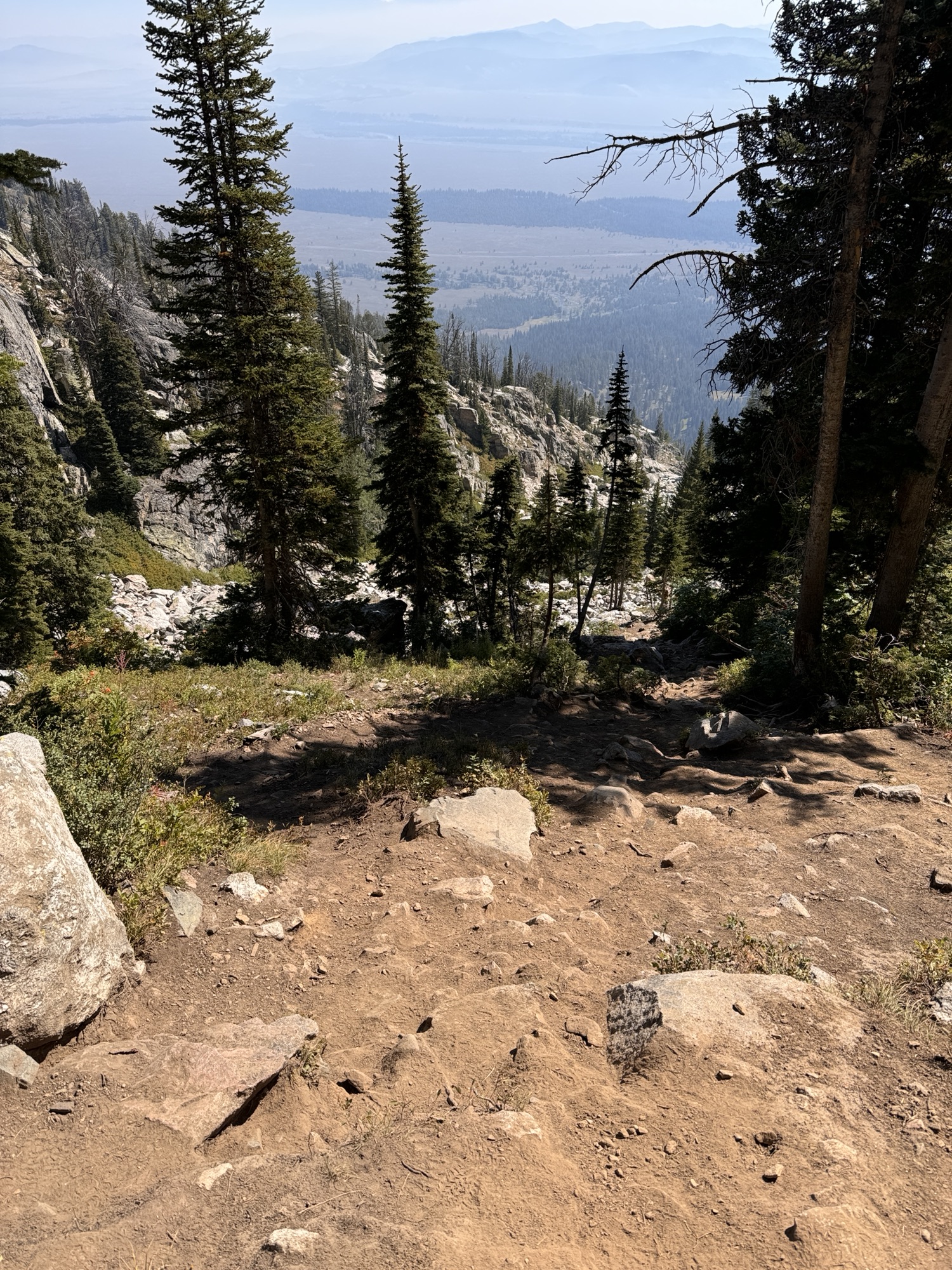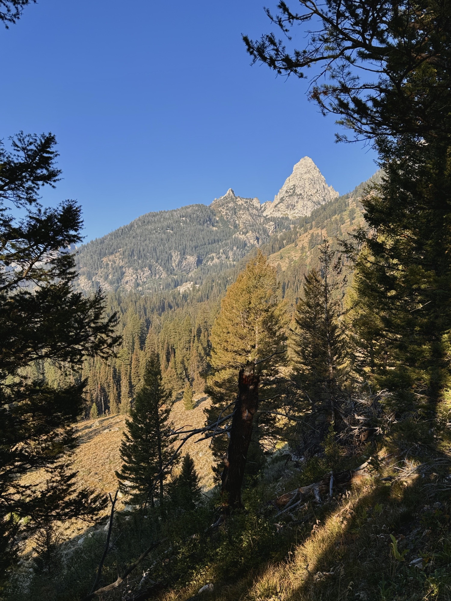 You start by walking through a dense pine forest and around some huuuge glacial boulders. Eventually, the Teton range starts to come into view through the trees.