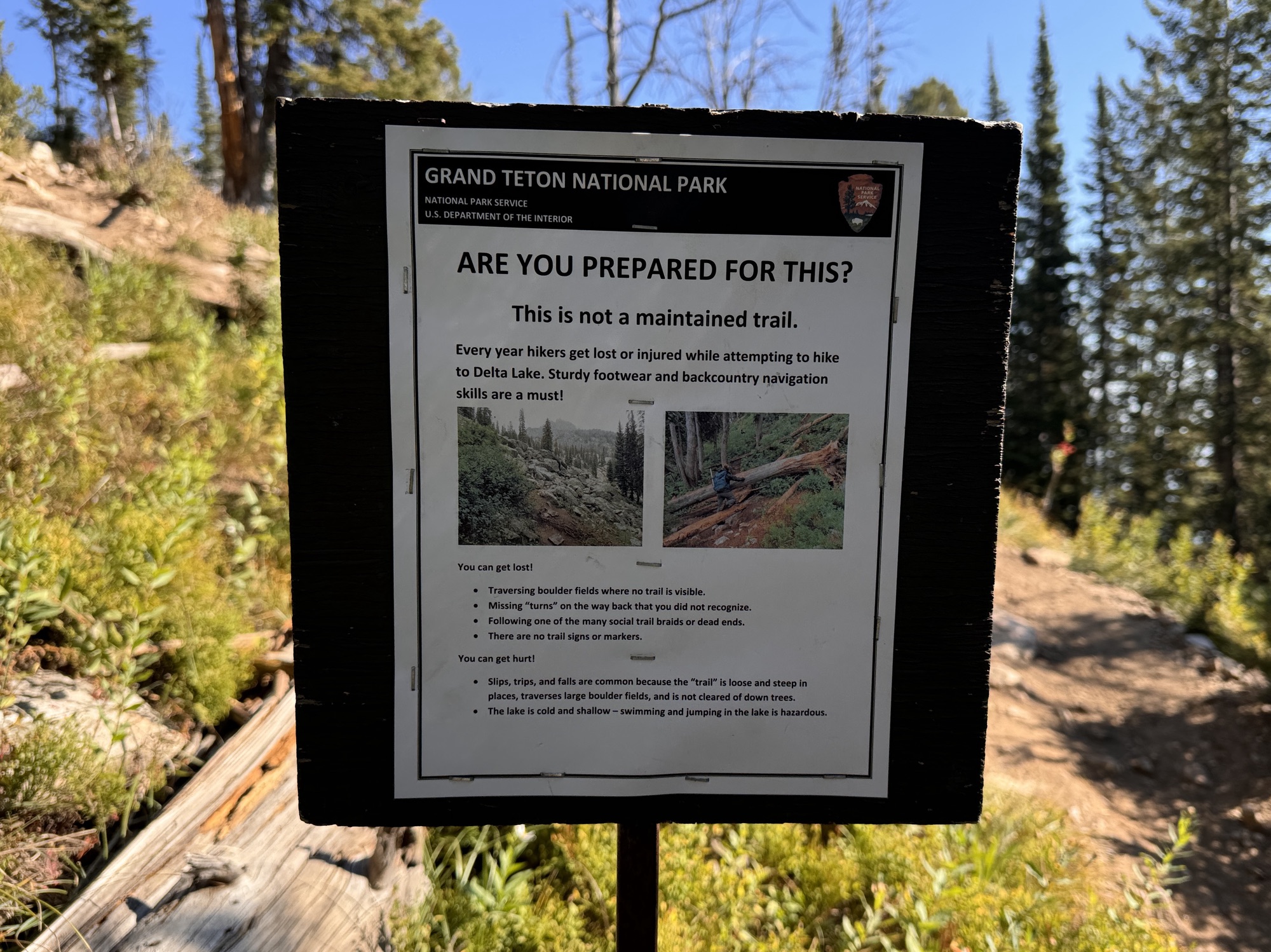 The stairs lead to a big ol’ log where you can chill next to this warning sign, then you’re on your way to the first boulder field.