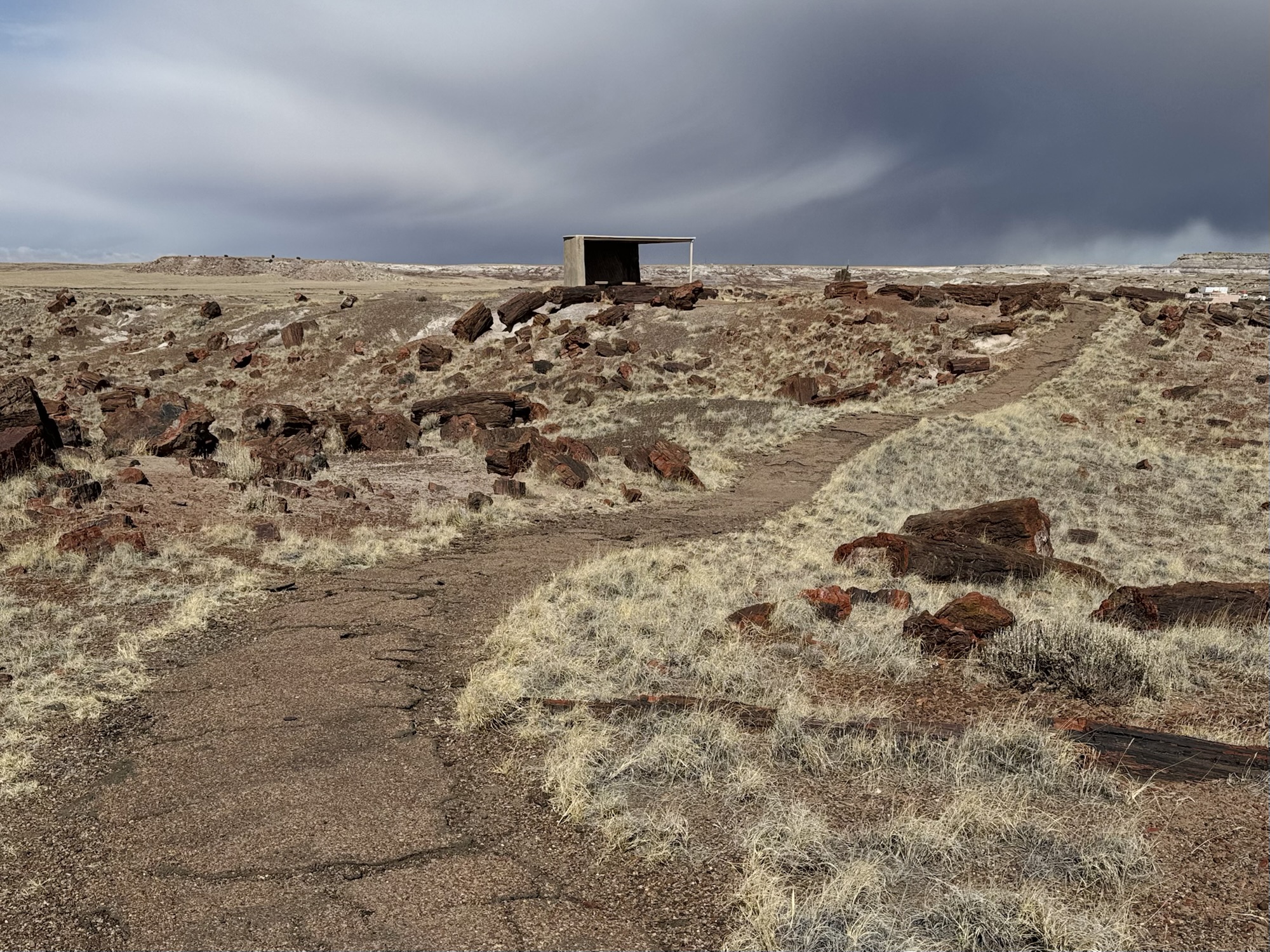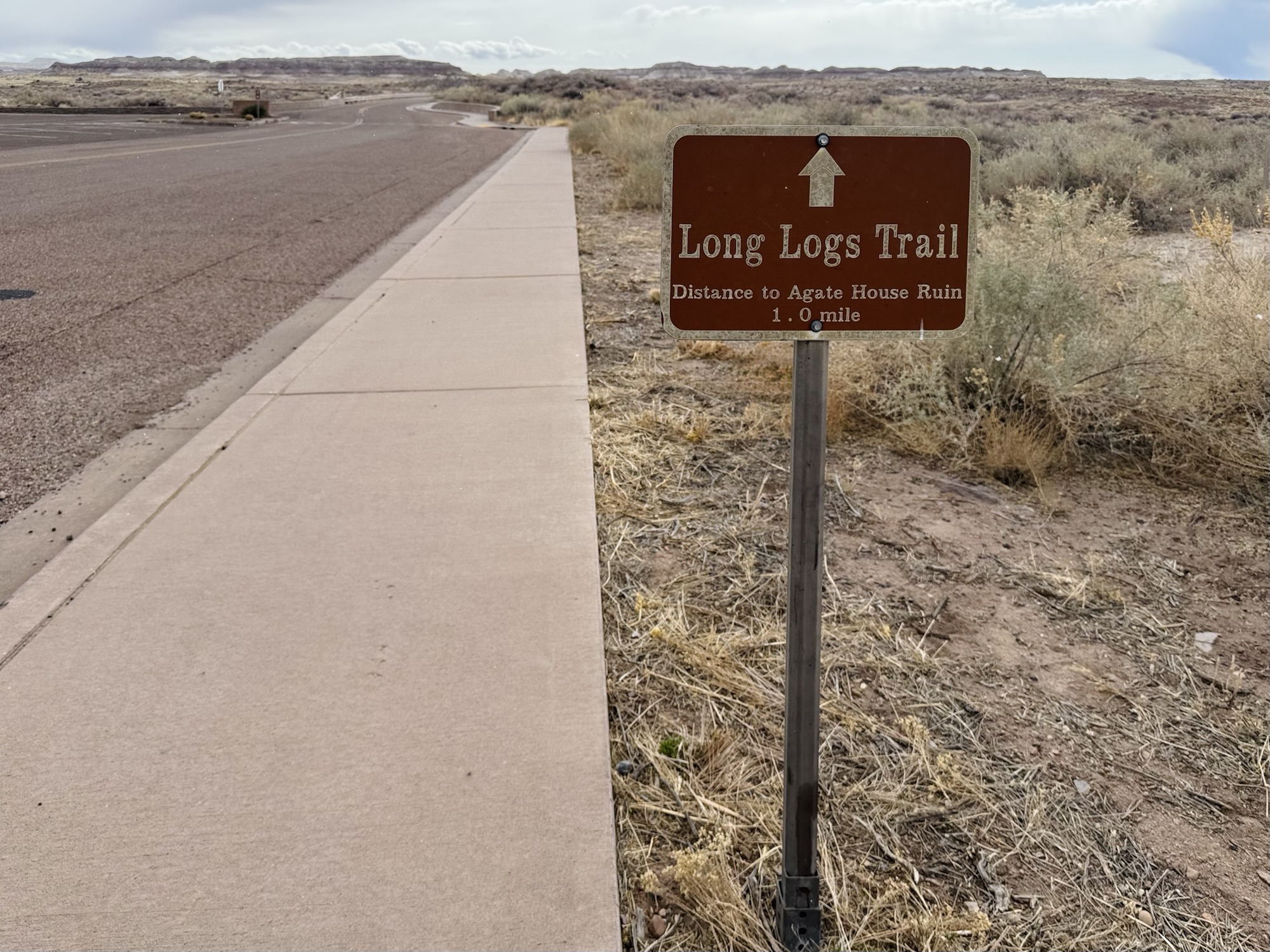 You walk a while on a flat asphalt-paved trail and admire an insane collection of different petrified stumps and logs, eventually make it to an area that looks like the Blue Mesa, and then make it to the star of the show: Agate House.