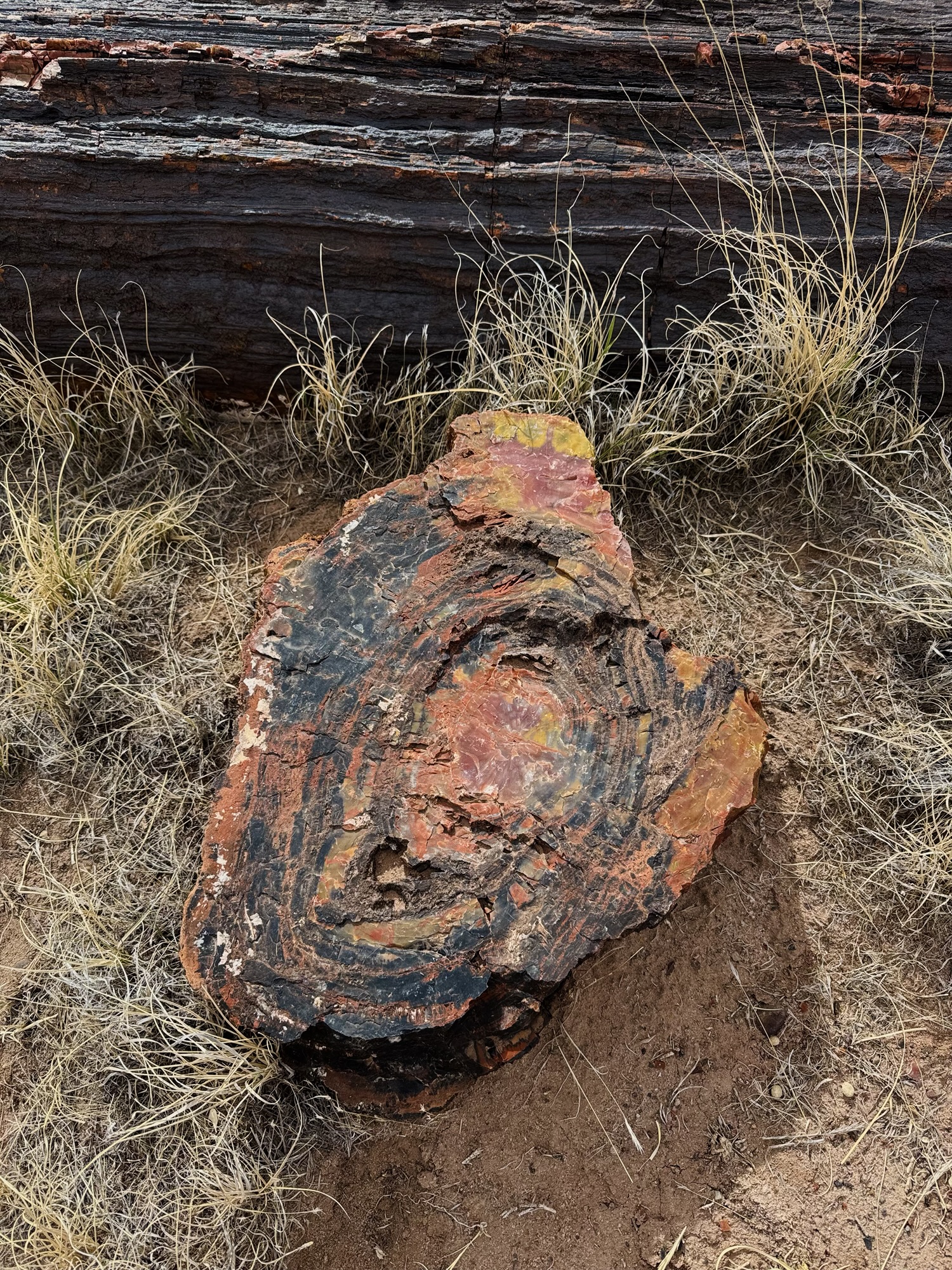 The sediment gradually crushed the trees and prevented oxygen flow, and over millions of years, underground, silica replaced every bit of wood that eventually rotted away organically, mixed with other minerals that were also in the sediment, and waited until wind and rain degraded the layers sediment extremely slowly over millions of years. They gradually became unburied and revealed what are now essentially rainbow gemstones.