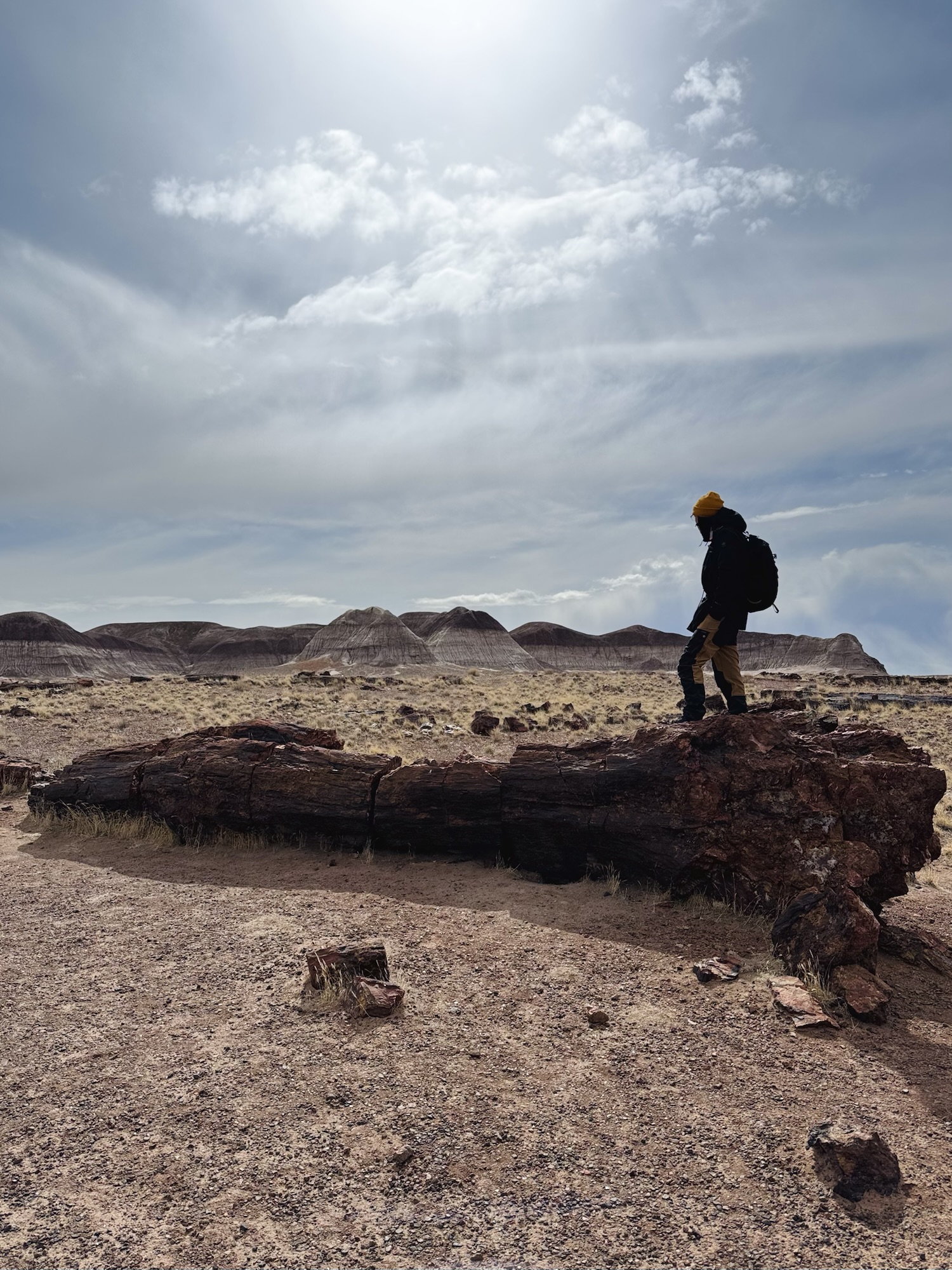We woke up on this morning in the cold April desert darkness after spending the night car camping in the Tonto National Forest. There was a three hour drive ahead to Petrified Forest so we started early. We picked up delicious breakfast at Bosa Donuts, somehow drove through super cold temps with some snow (???), and made our way.