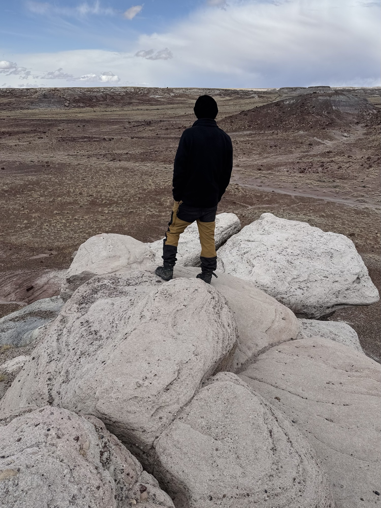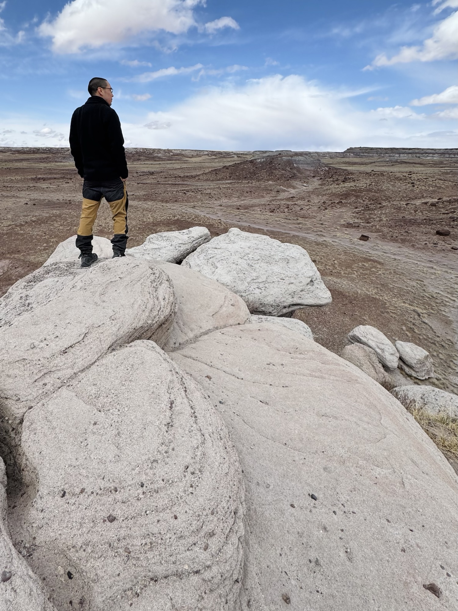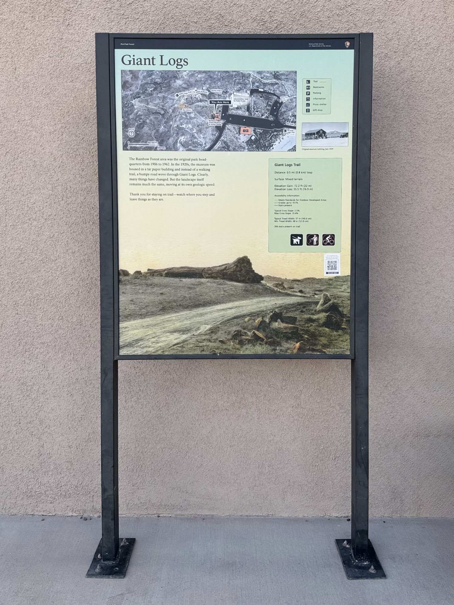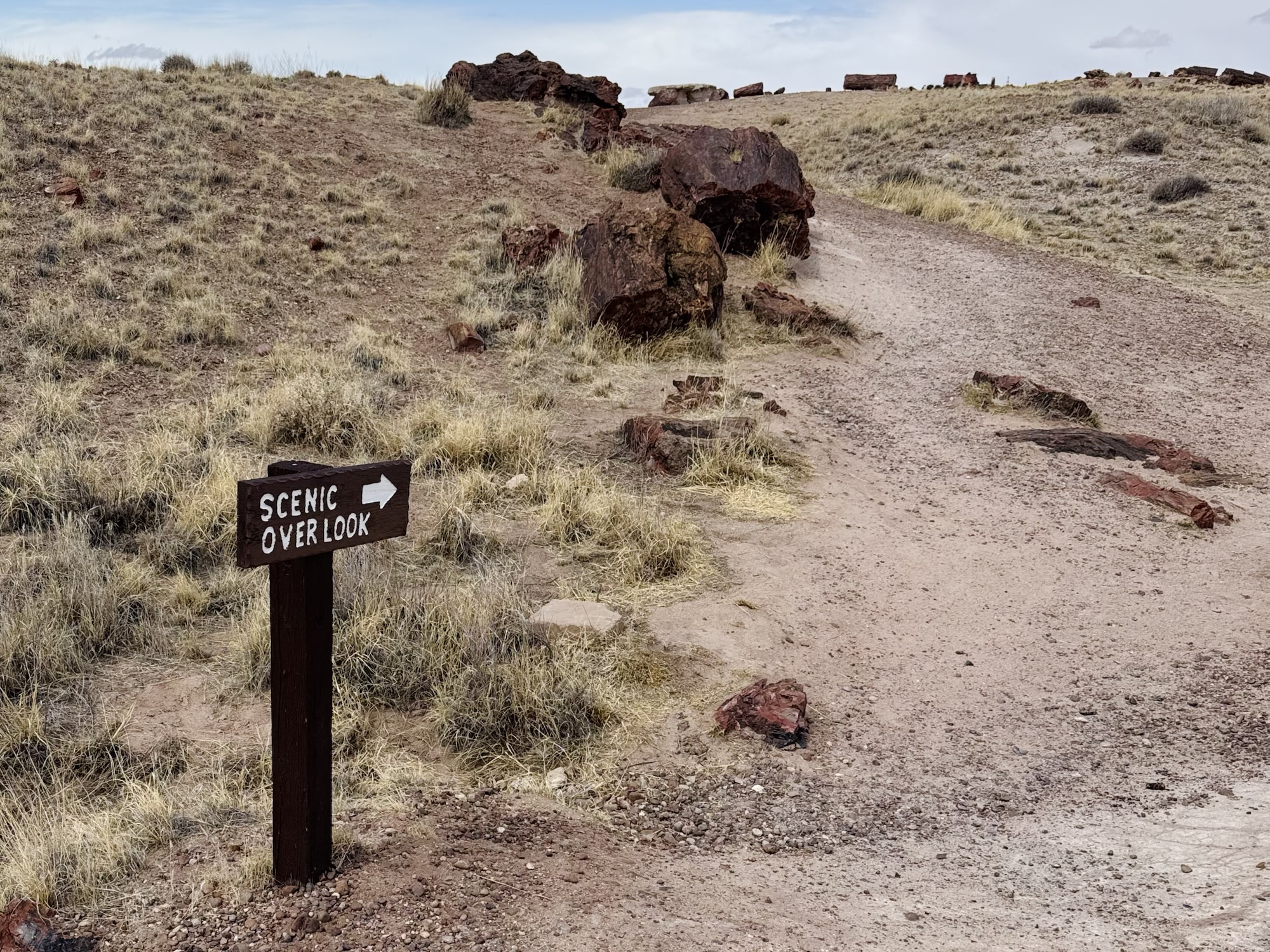 The trailhead for the Giant Logs is right behind the Rainbow Forest Museum and leads you on a half-mile long, asphalt-paved sidewalk, winding around large stumps and logs of petrified wood, and out to the most beautiful, colorful, and desolate scenic overlook.