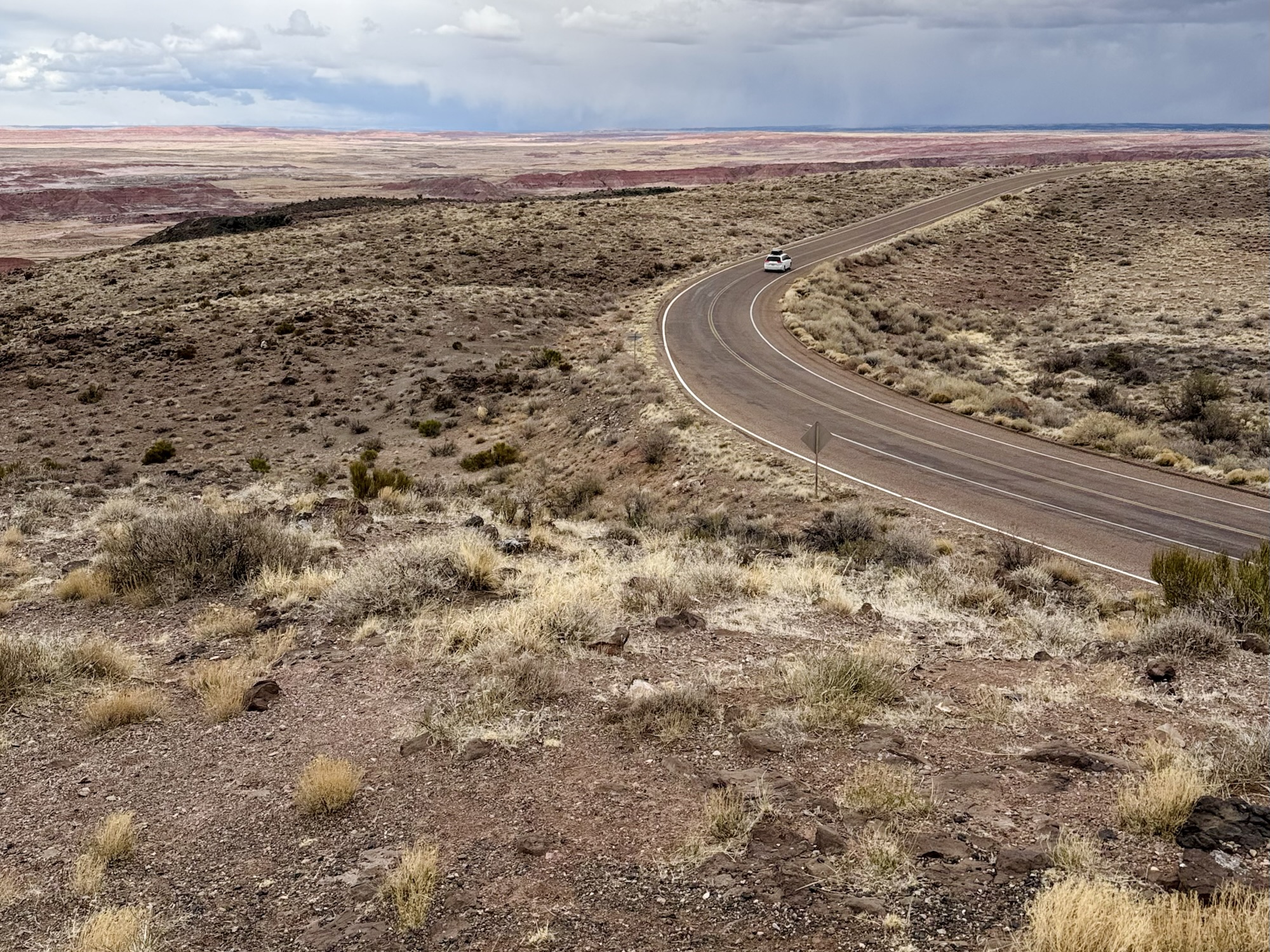 We headed to the parking area for the main off-the-road overlook and soaked it all in. In front of us, the sun was beaming on the pink desert and making it turn neon. Behind us, the thunderstorm continued to roll in and the shadows it cast had become closer than ever.