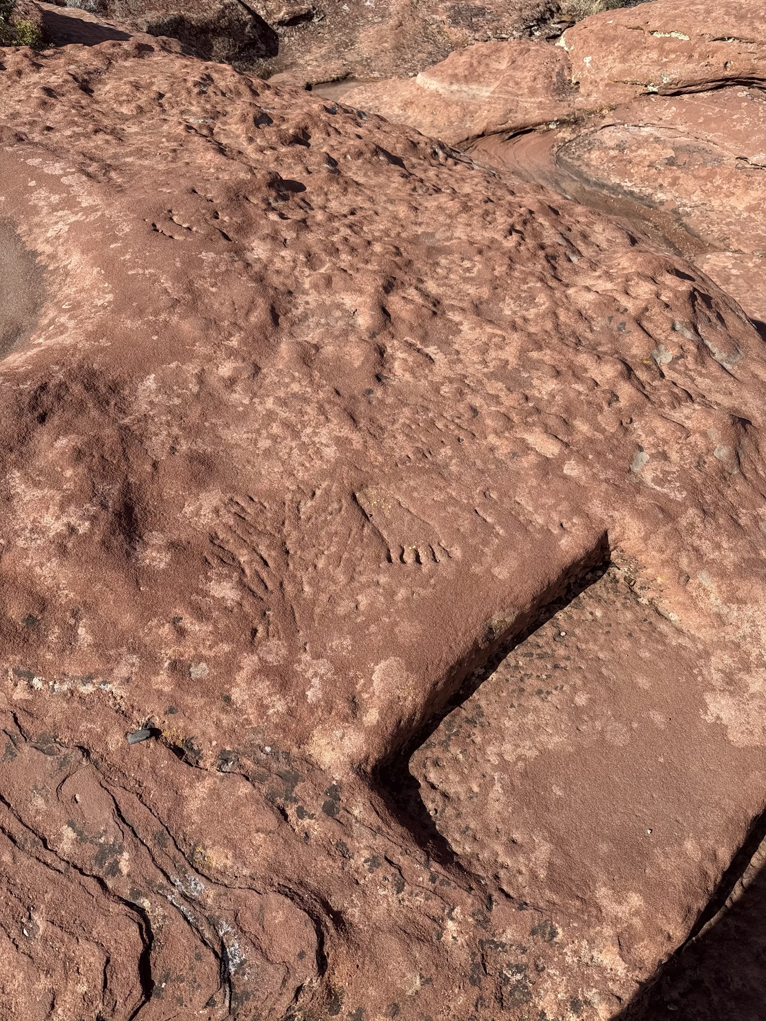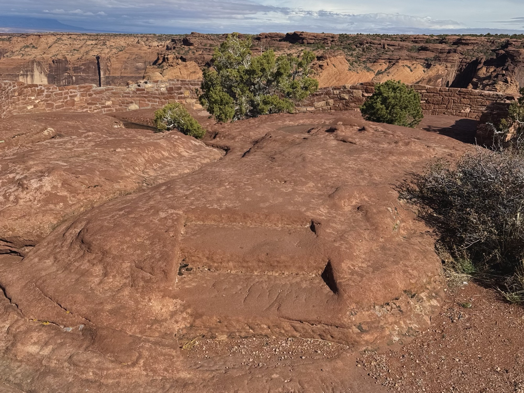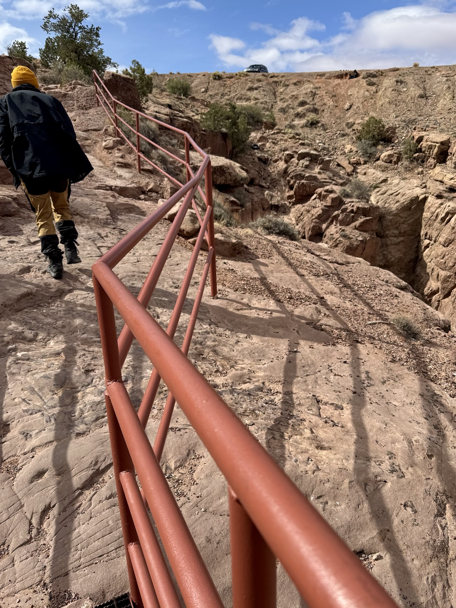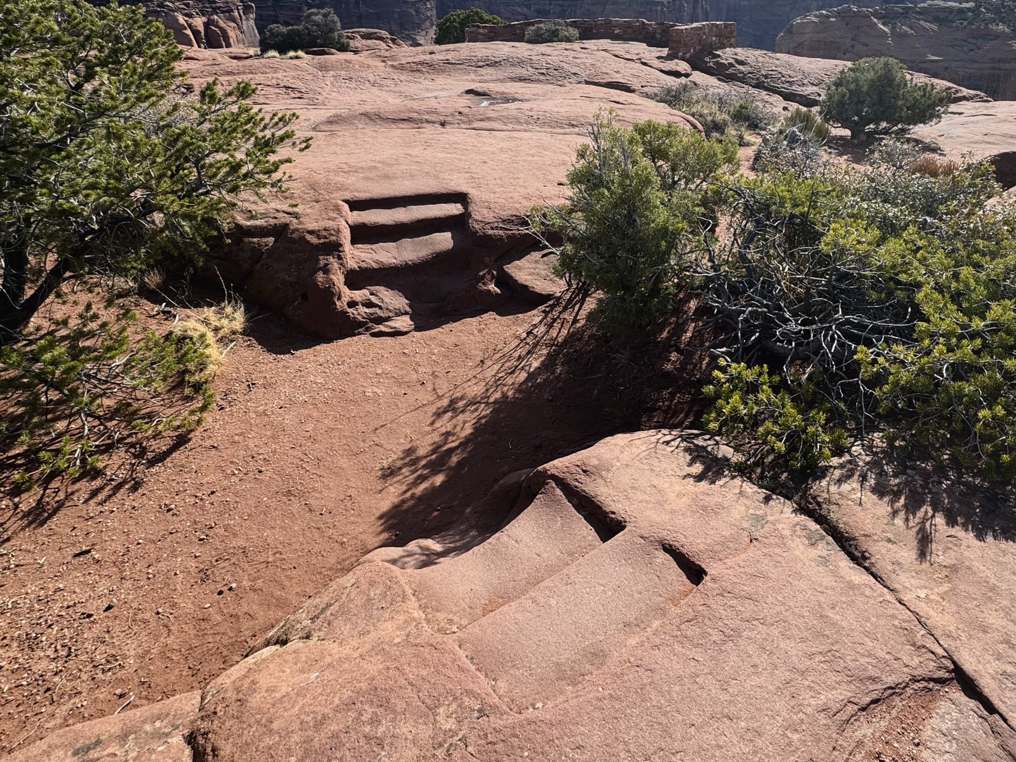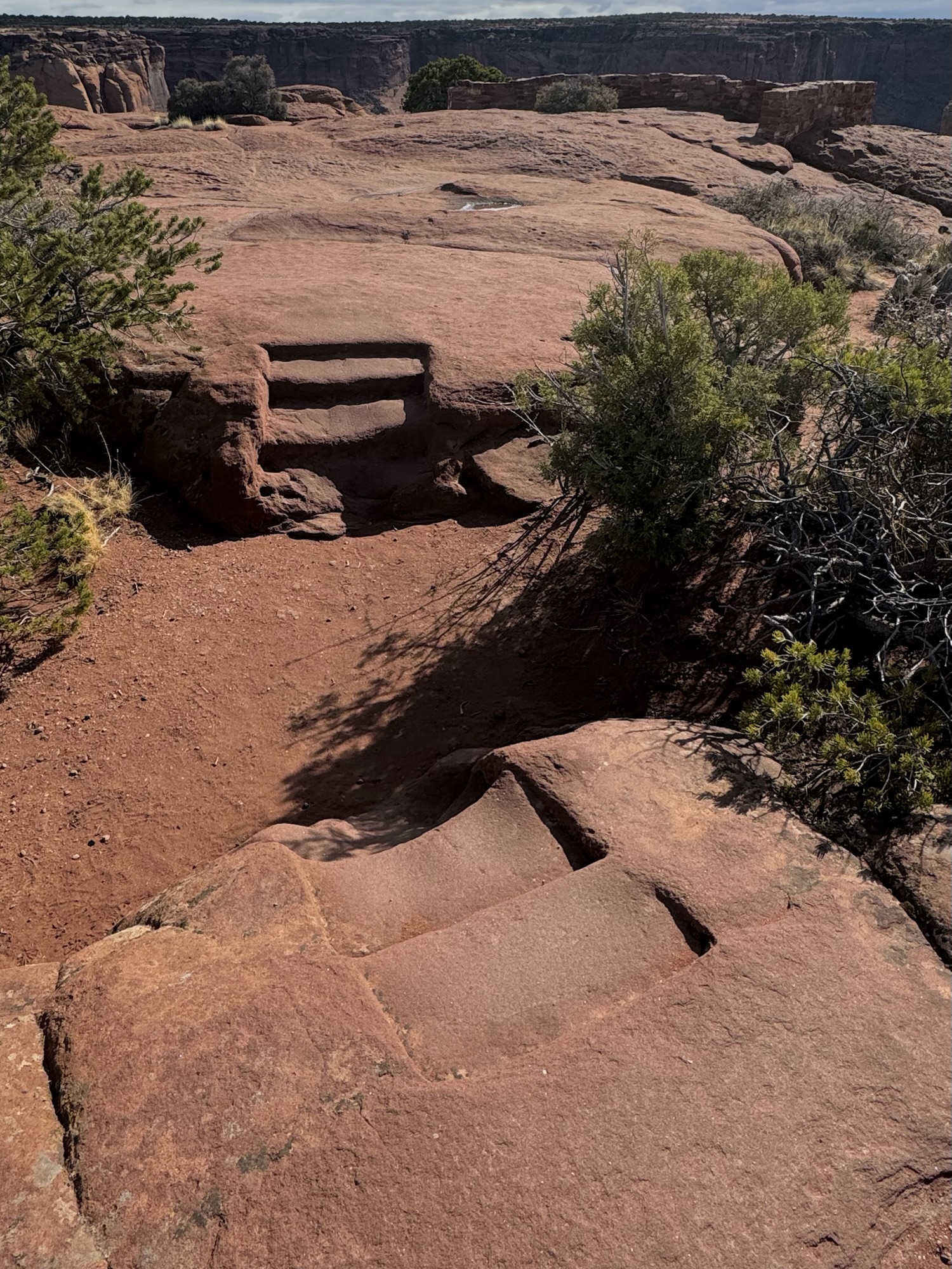 There is a loose, casual trail you can follow to the overlook areas, but you can walk pretty much anywhere you want along the edge of the rim and on top of the rocks, etc. This entire area is the foundation of a group of structures were people lived, worked. It was so cool to see the stairs carved into the rock and the wear from people using them over time.