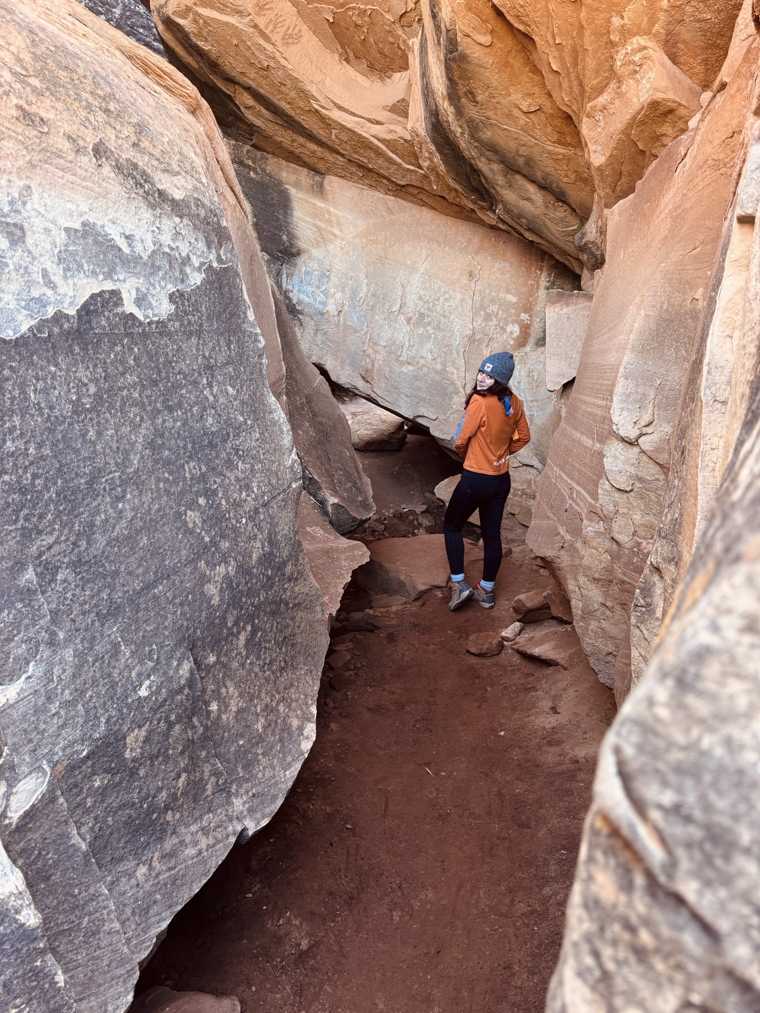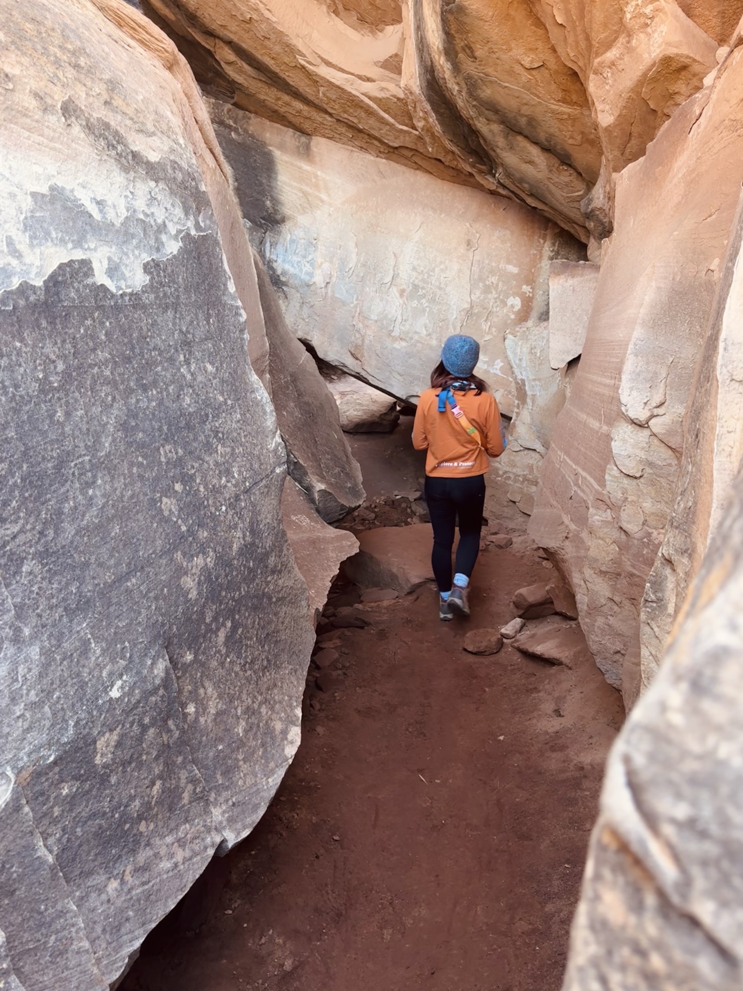 We turned around, returned through the little slot canyon cave area, and took one last look to soak it all in before backtracking to the car and high tailing it to our next stop: Canyonlands.