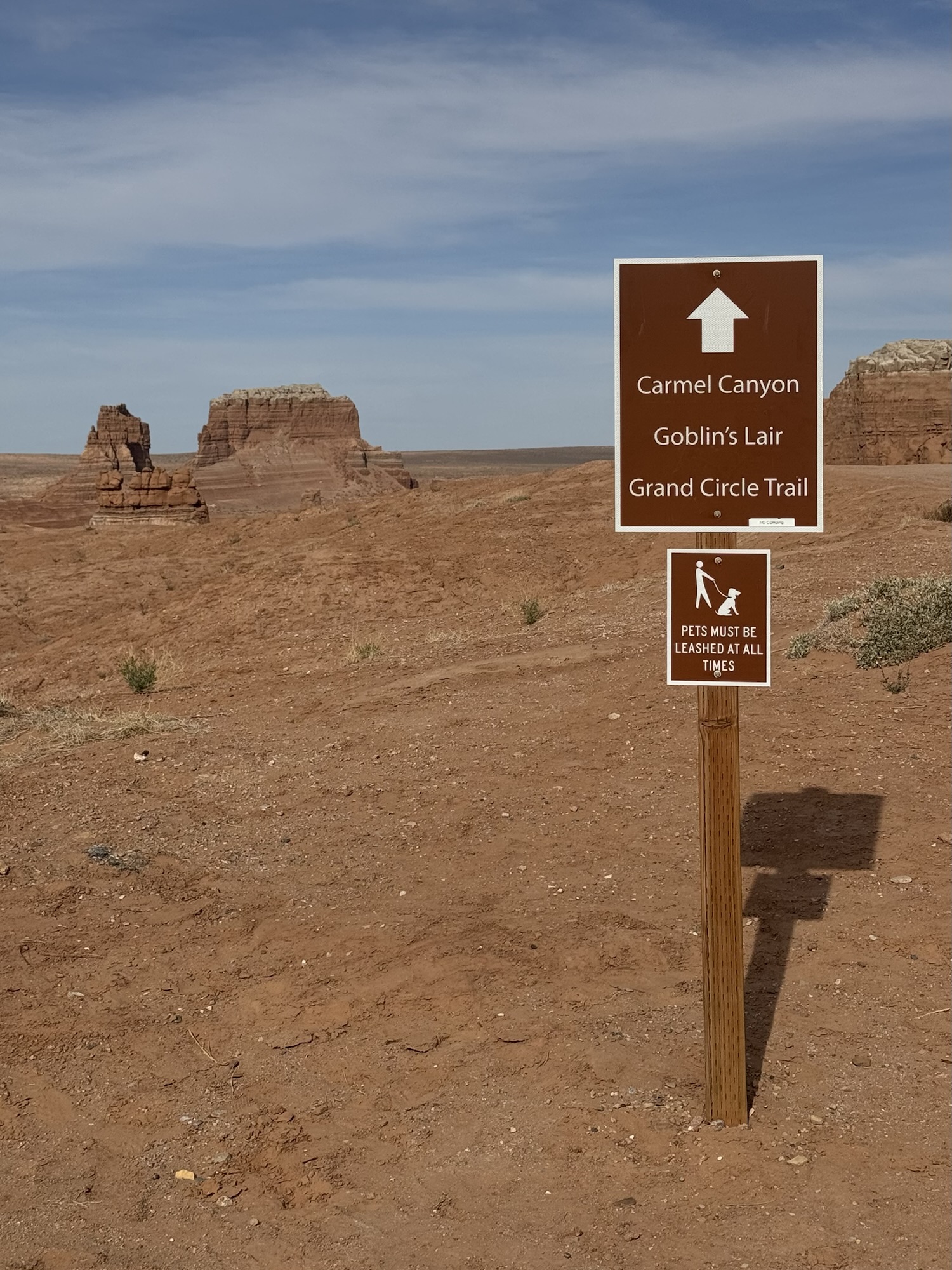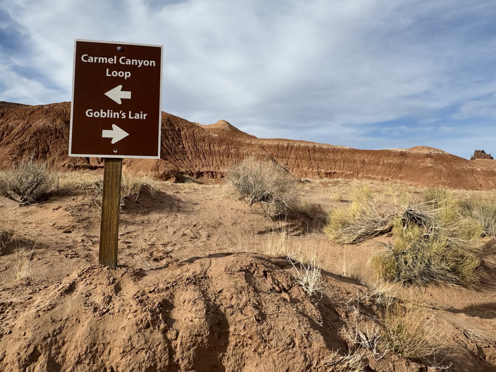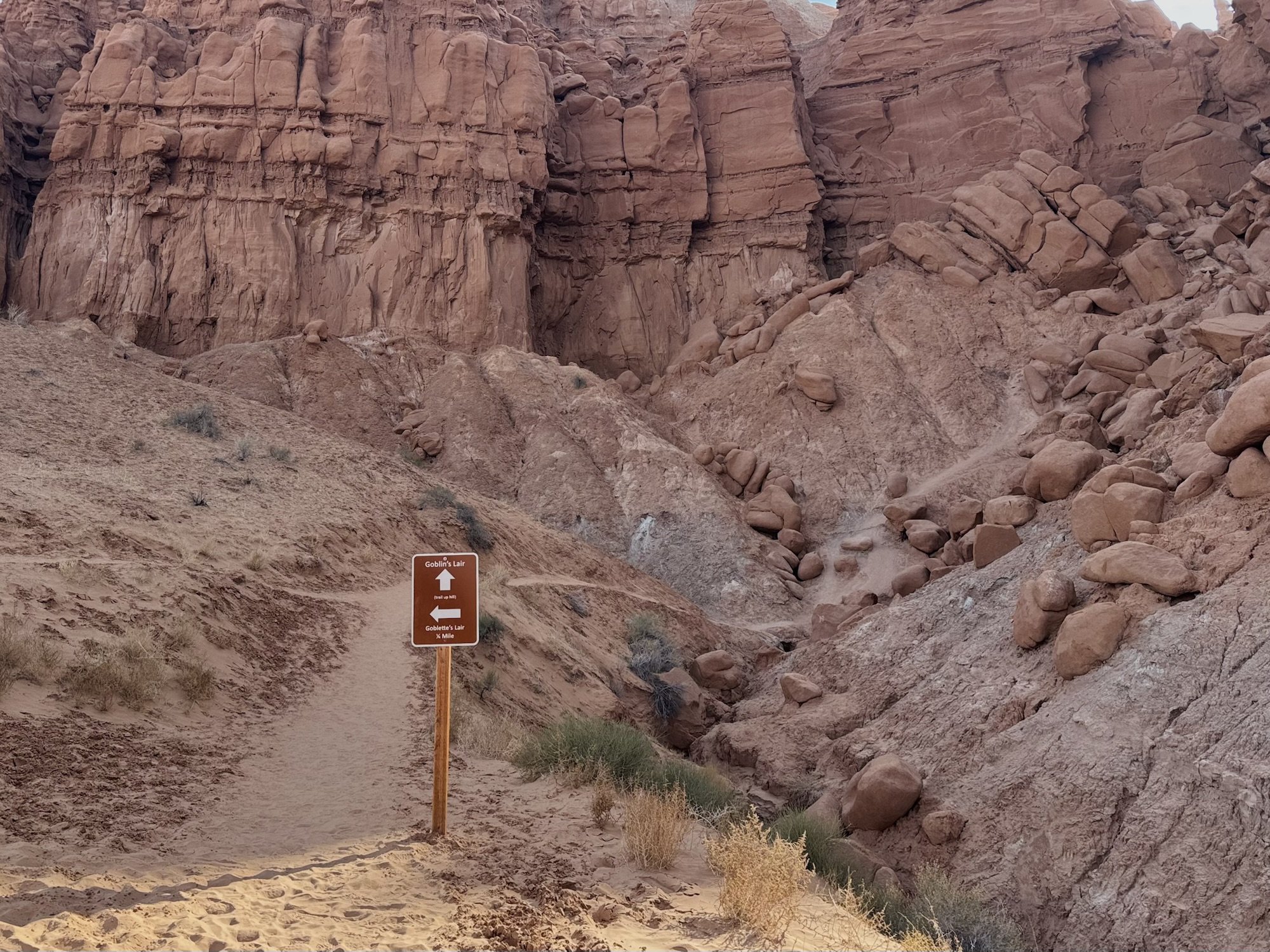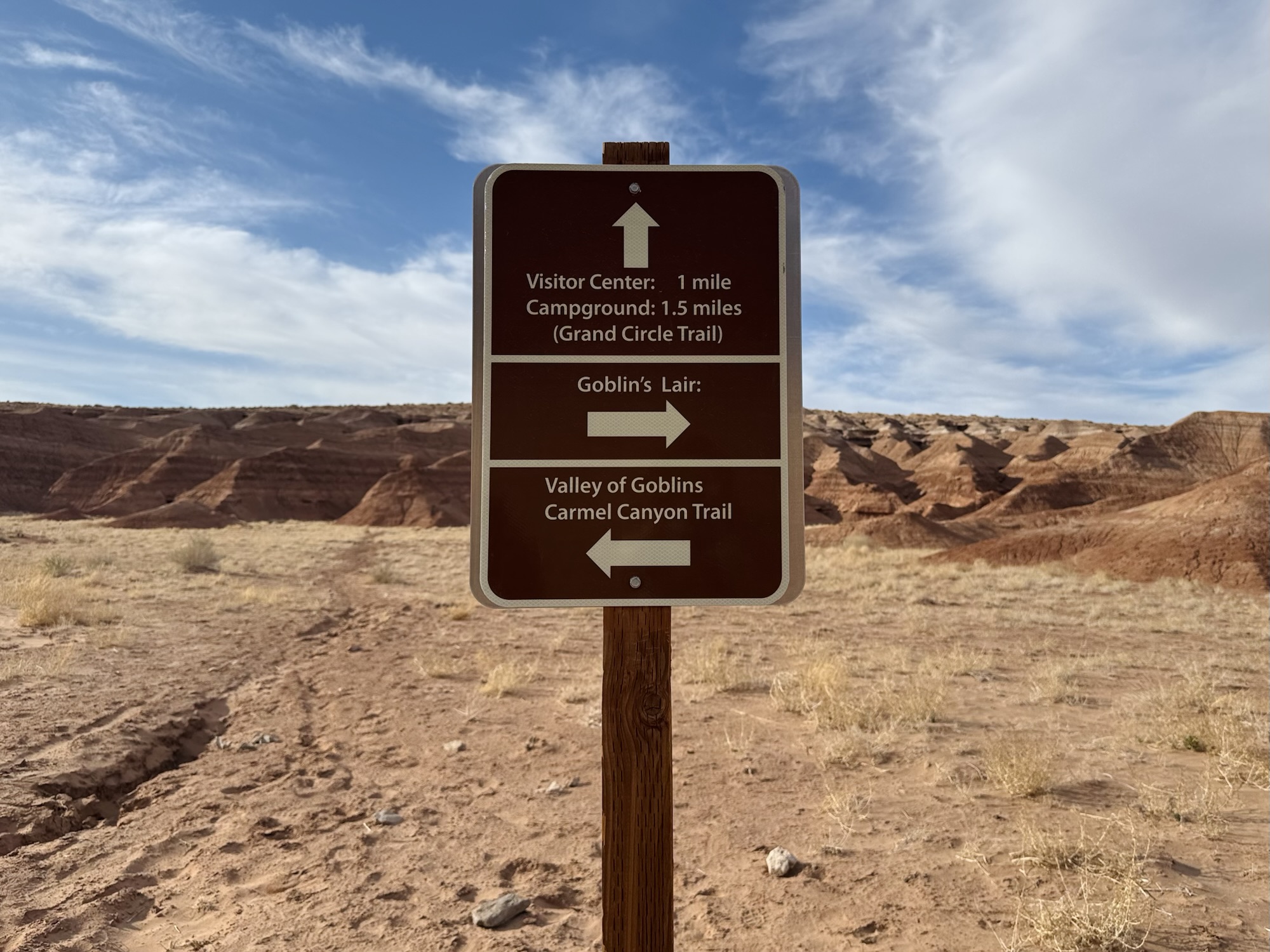 We drove in to the park and headed to the trailhead for Valley of the Goblins which would be our home base for both things we wanted to do, the first being a 2.5 mile roundtrip to the Goblin’s Lair. At the visitor center’s tiny parking lot, there’s a sign saying it’s the trailhead for the Goblin’s Lair. You can do that too, but I liked our way better and it leaves you car in a way more centralized place.