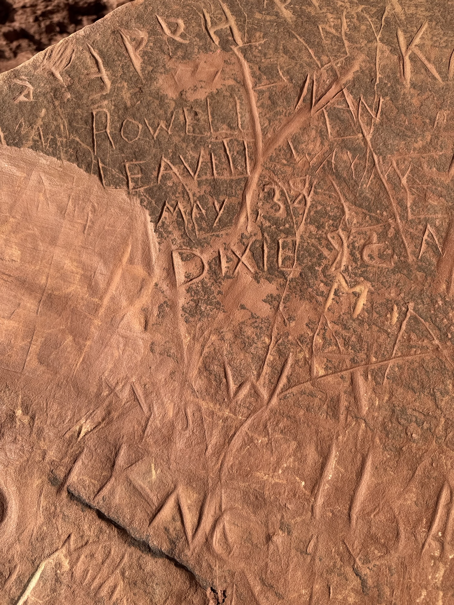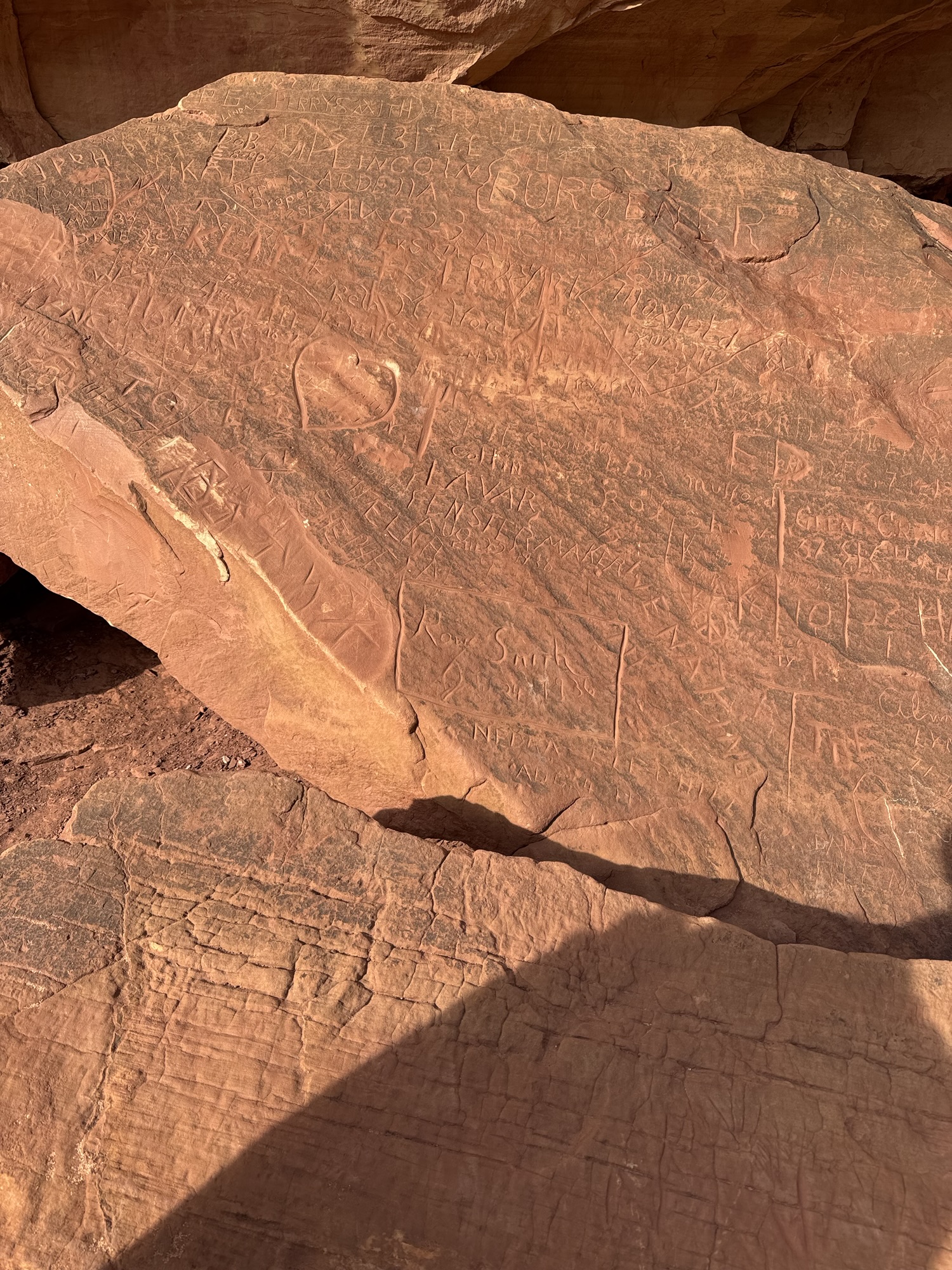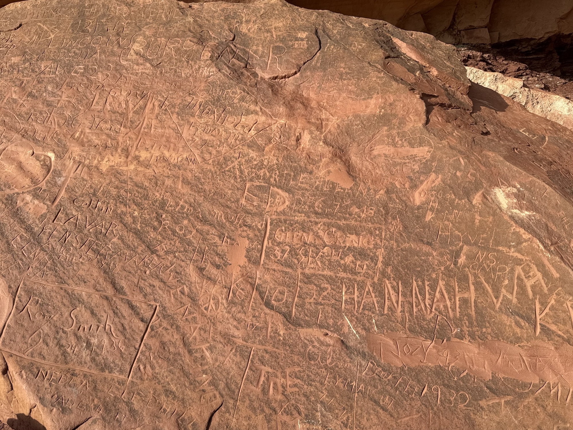 Right here near the base of the bridge, there’s a pile of redder sandstone boulders that people have been carving their names into for over 100 years. It reminds me of the carvings we saw on our hike at Kaaterskill Falls in New York, and some we saw last week on Dan’s Mountain in Western Maryland.