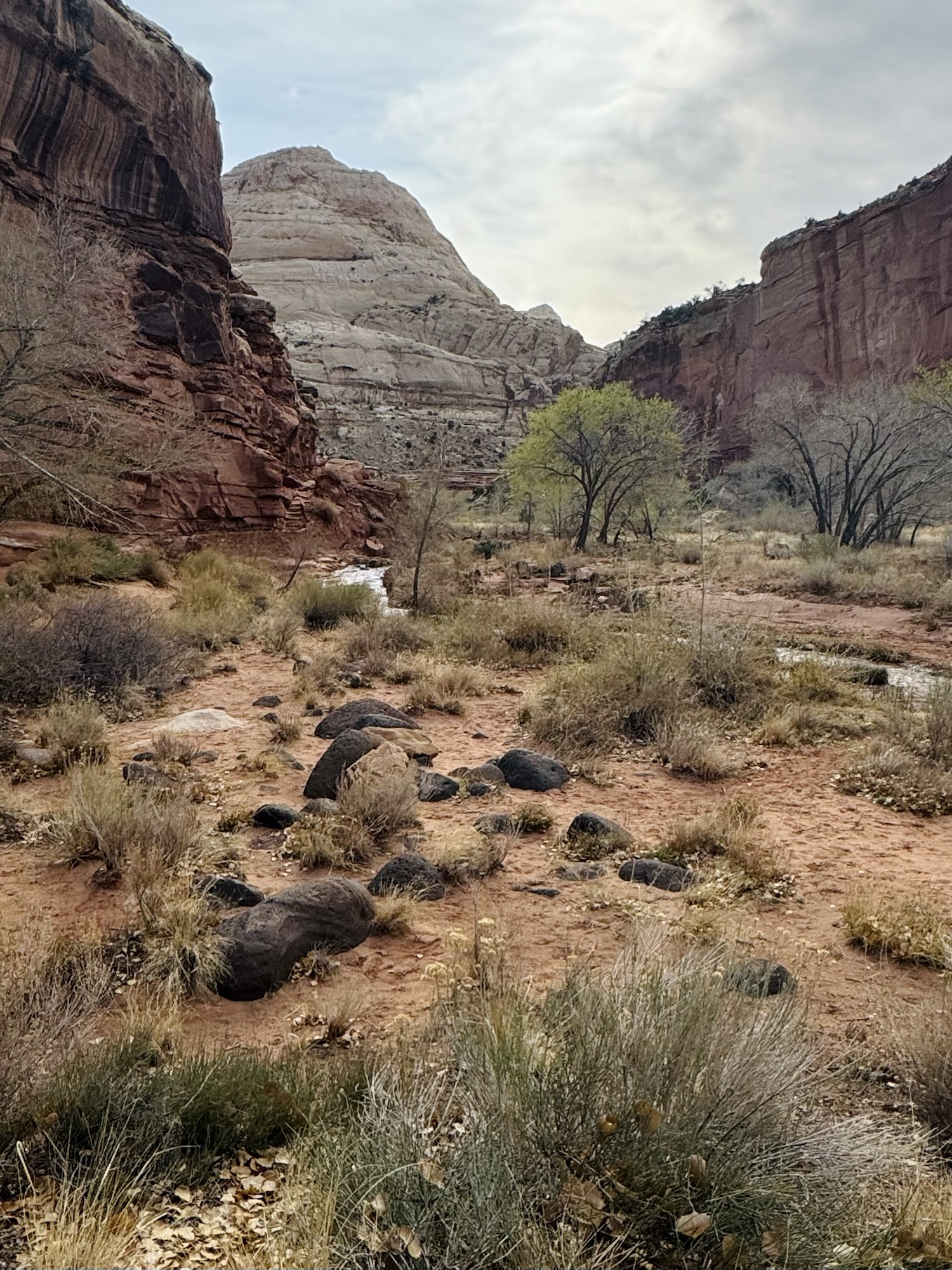 The rocks here reminded me so much of ones we’d seen in Lassen Volcanic National Park a few years ago. On this trail, you can pick up an interpretive trail guide that tells you what you’re looking at as you walk. Apparently, these black boulders are from the tops of neighboring mountains and have gradually tumbled into the valleys of Capitol Reef via flooding and riverflow. They look just like lava rocks to me, but after reading about them while making this post… I guess they’re not? But they’re still so awesome. Some of them are really huge.