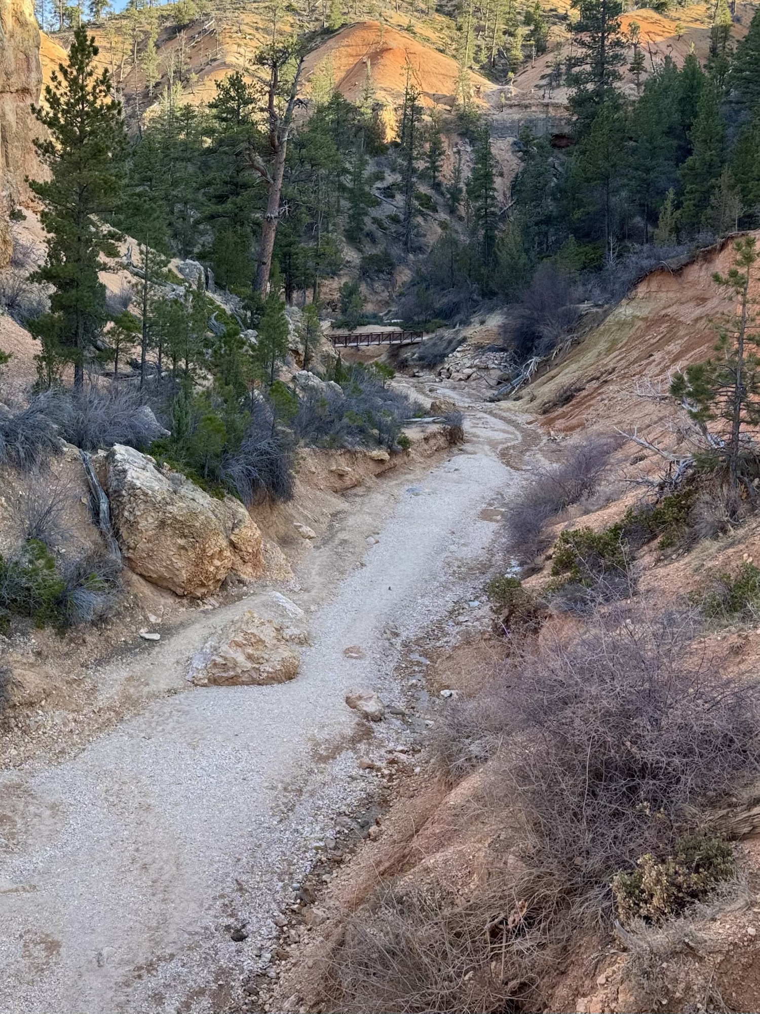 After backtracking from Mossy Cave and passing that golden trail marker, we headed straight this time (to the right), which lead us across a cute stream and gave us another view of that cute bridge. We could finally see the other side of the hill where the river usually was, except it was still completely blocked with snow/ice, which then meant the waterfall was dried up.