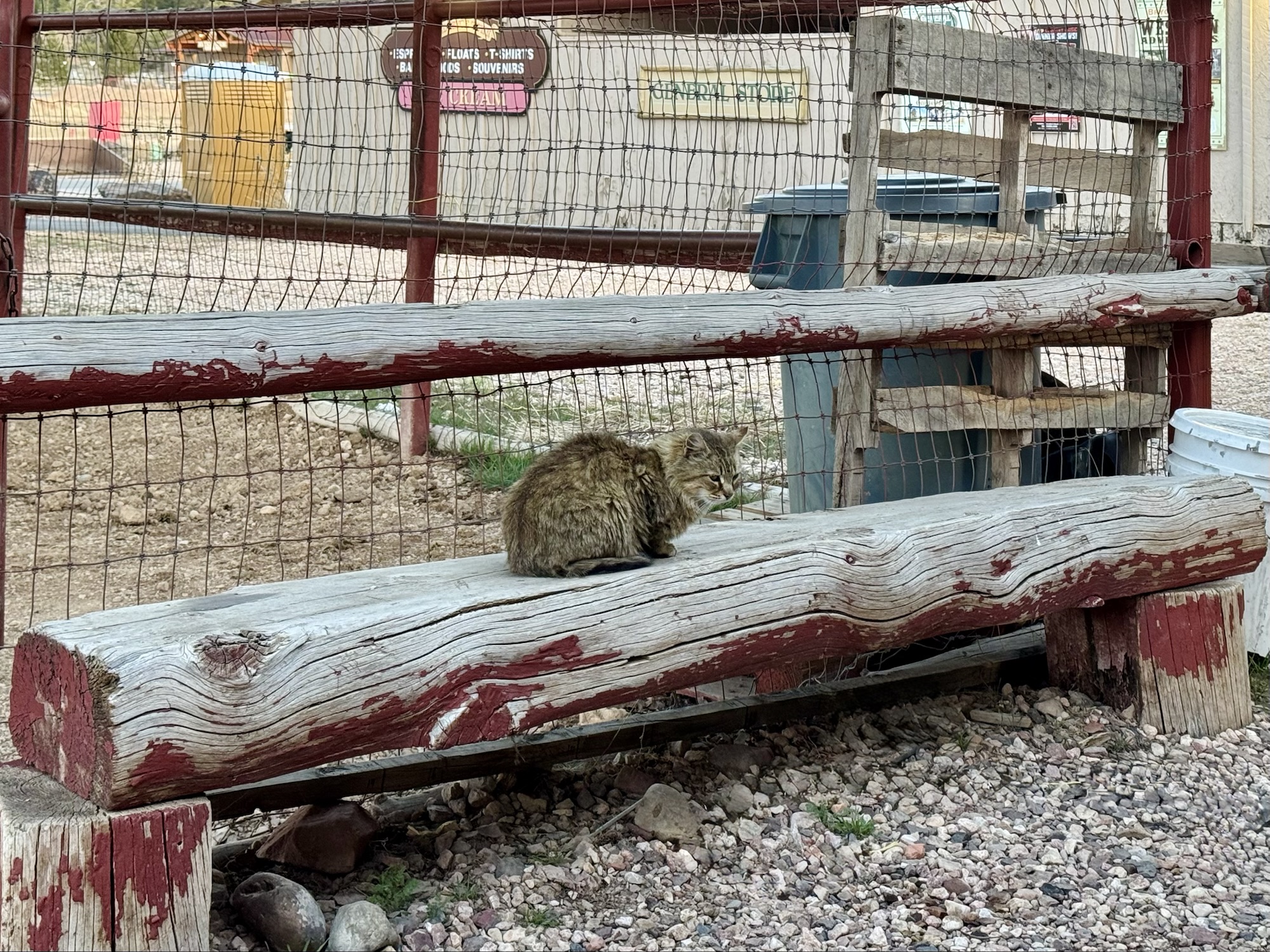We didn’t realize how late it’d gotten and everything closes by 8:30pm, so we basically ran across the street to our hotel’s restaurant and grabbed dinner. The area where we walked through was like a little western town with a rock store, souvenirs, etc., but it hadn’t opened for the season yet. We walked back to the room and spread our dinner out smorgasbord style as always. We got a pizza to share, and Ike got orange chicken with rice while I got a grilled cheese haha. We also ran into this super cute spicy community kitty.
