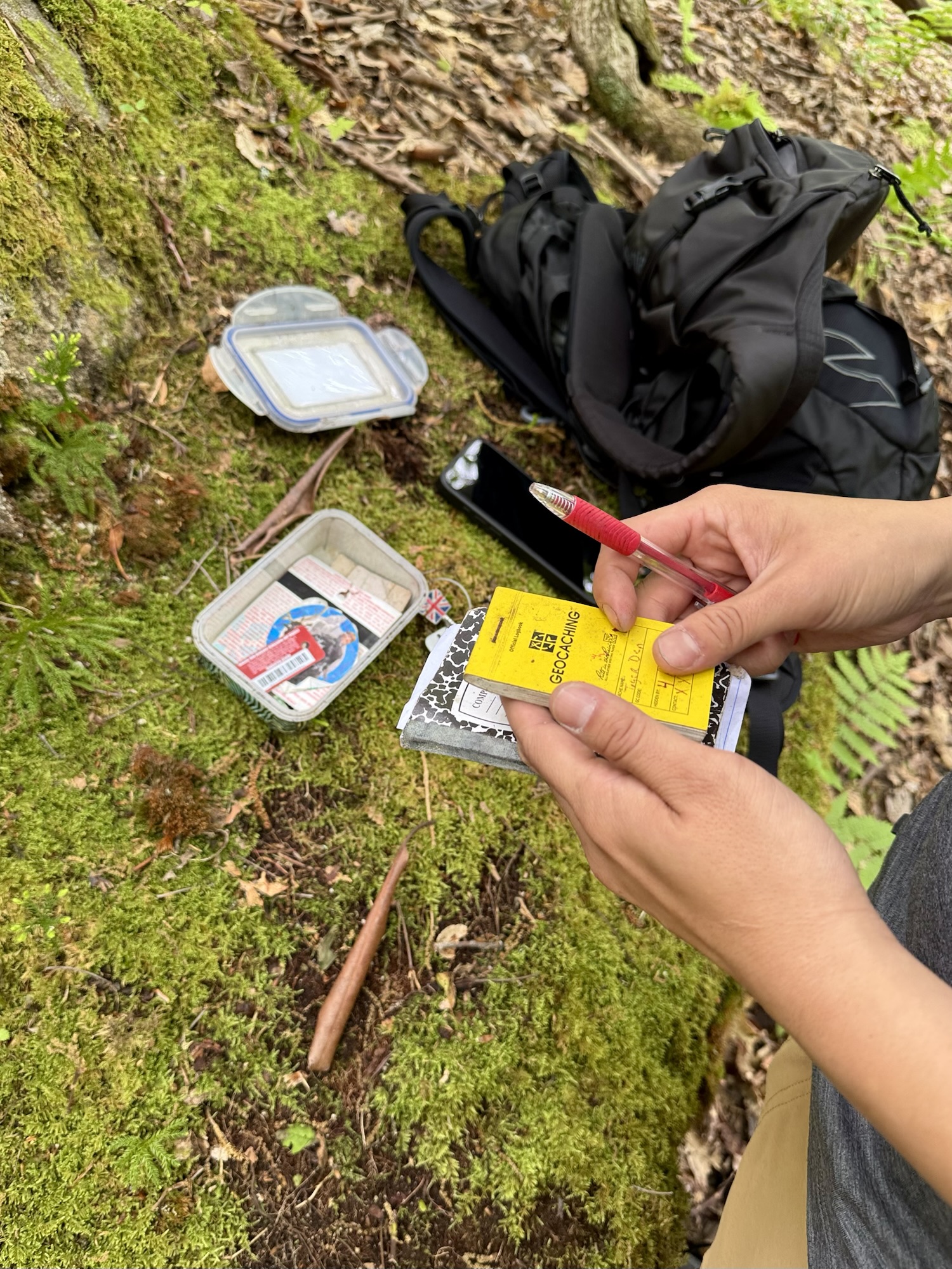 At one of the edges of the maze, we snuck into the woods to find a hidden geocache. Annnnd of course I took the opportunity to eat some of the snacks we’d gotten the day before at Candyland.