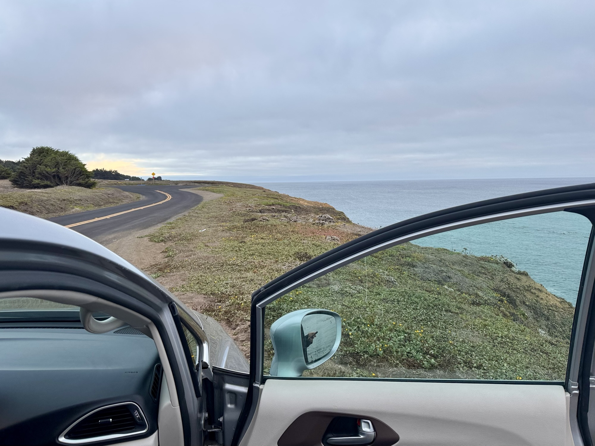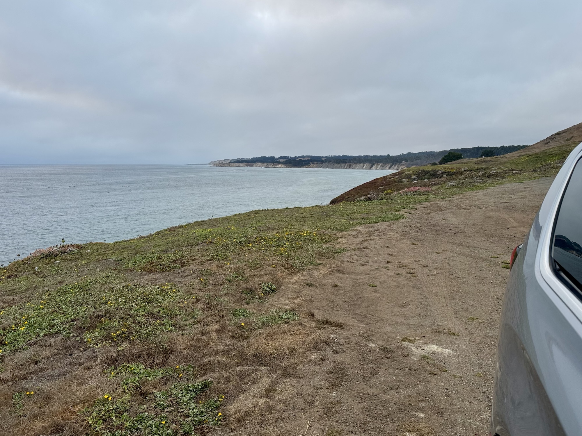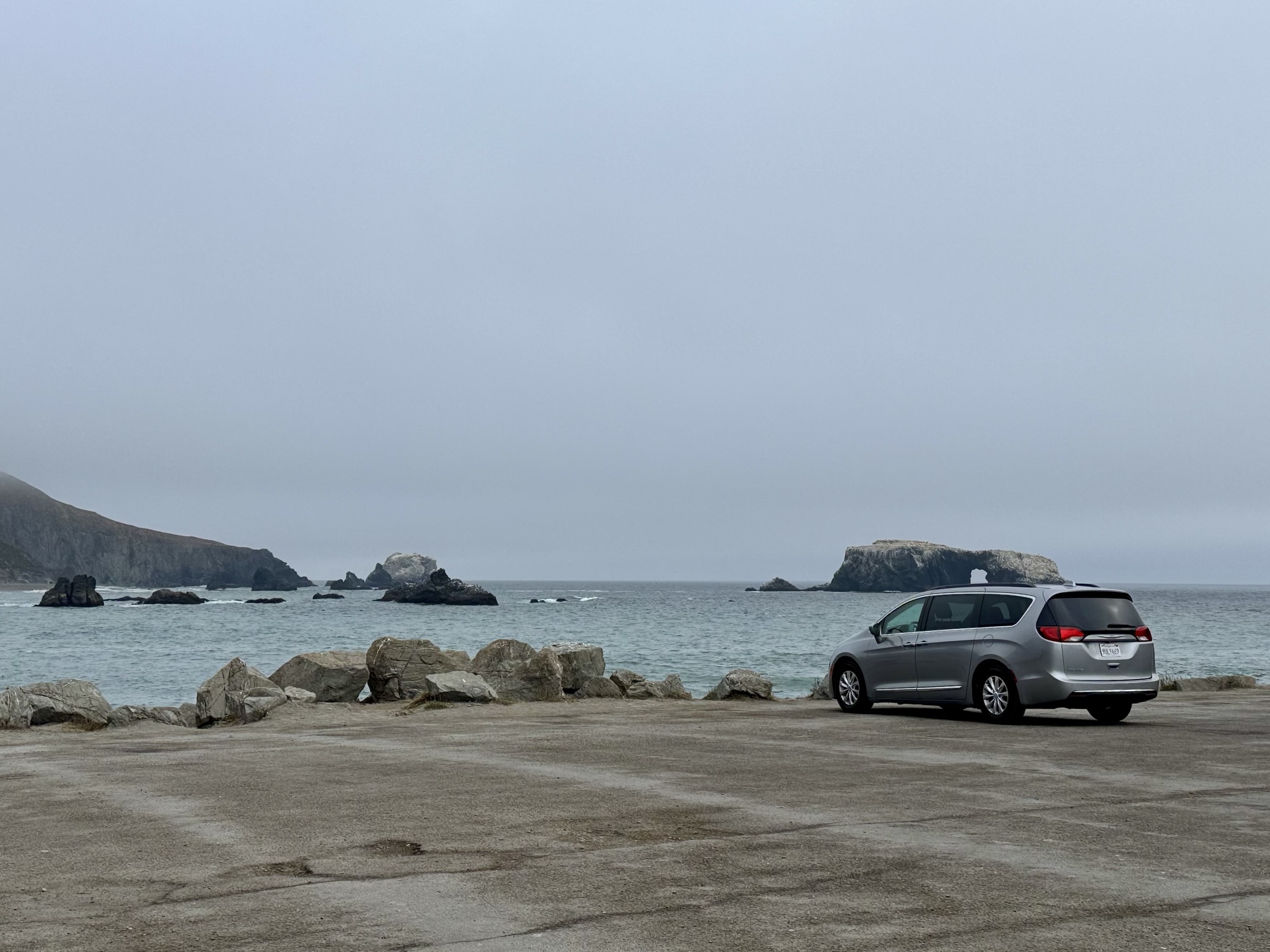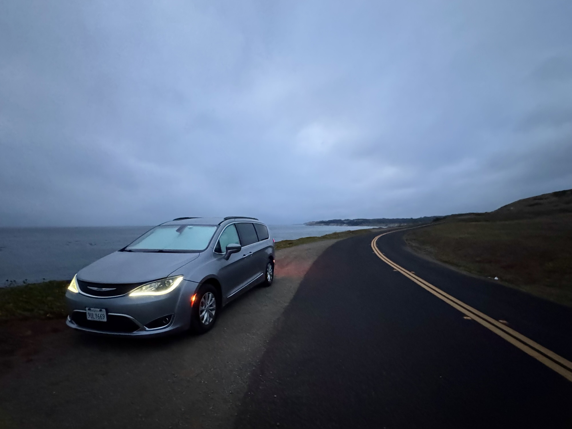 We left Goat Rock at 6PM and drove about another 90 minutes before finding the most perfect sleep spot ever, tucked in a private area away from the highway and with 360 degree views of the ocean. The soundtrack we had for sleep was *chef’s kiss* and by the time the sun set in the cloudy grey sky, it was 8:30PM. We were wiped out.