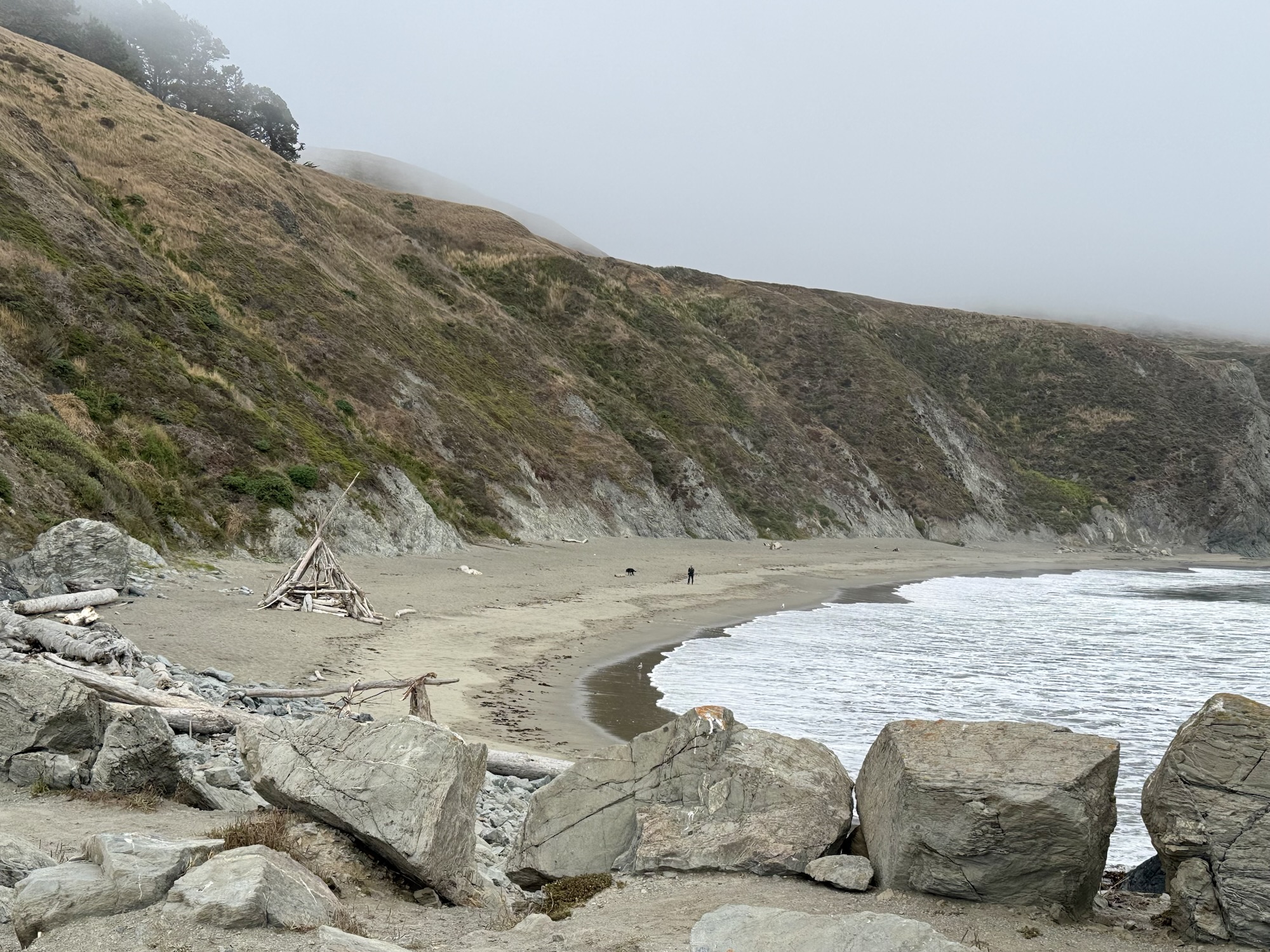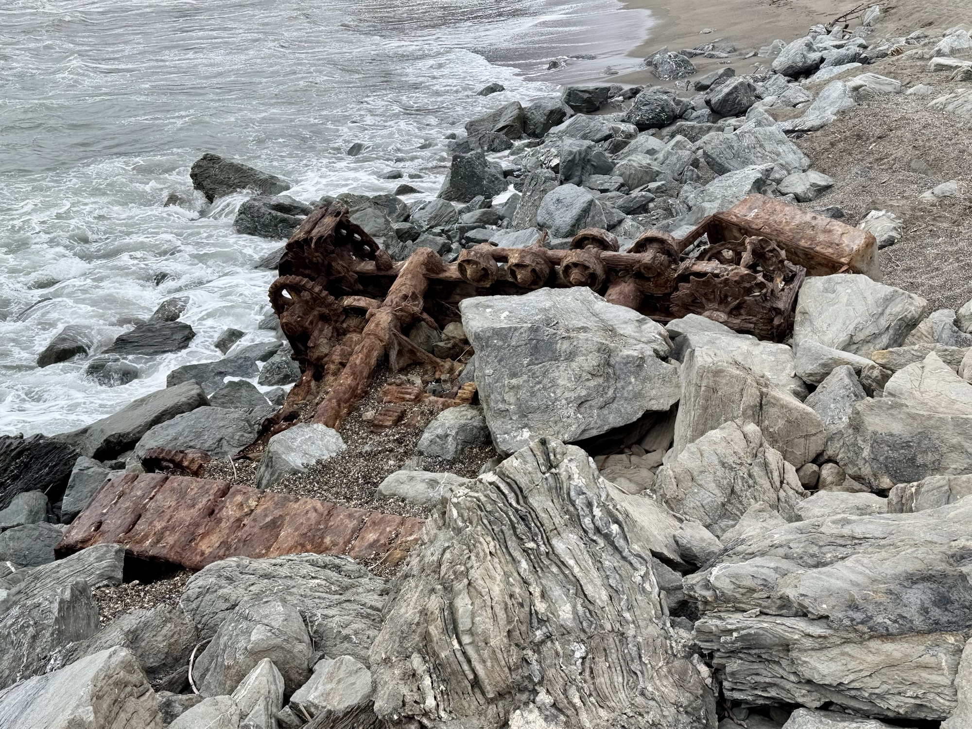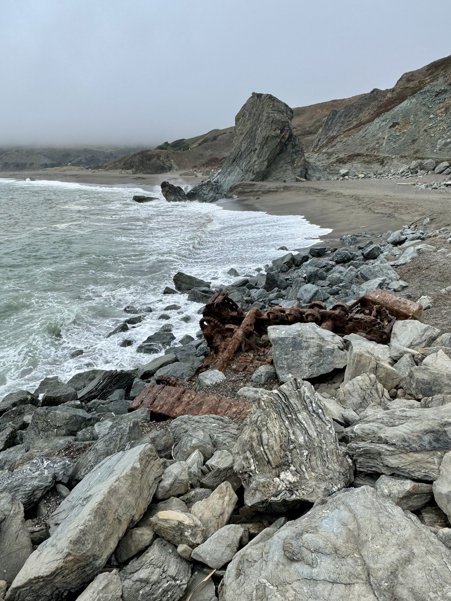It was so moody and beautiful while we were here. I was imagining that the giant bleached tree trunk was a whale bone. There were some rusty ruins of what was probably a bulldozer, and a memorial to someone whose anniversary of going missing (and birthday) were coming up.