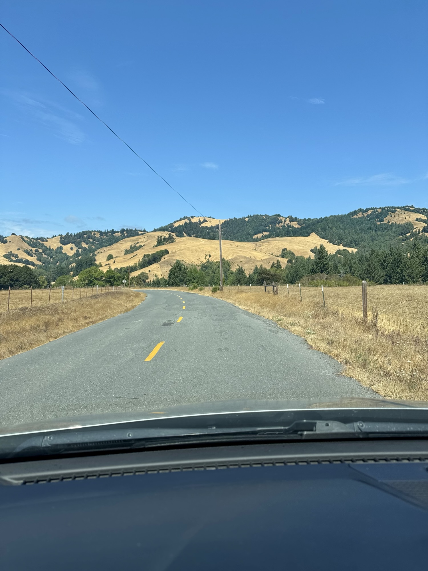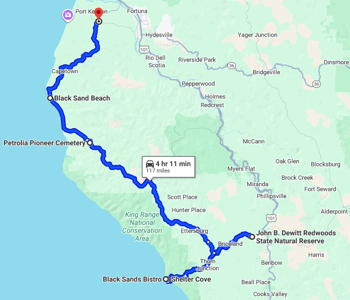 Shelter Cove Road to Briceland Road to Ettersburg Road to Wilder Ridge Road aaand finally through the tiny town of Honeydew to Mattole Road.