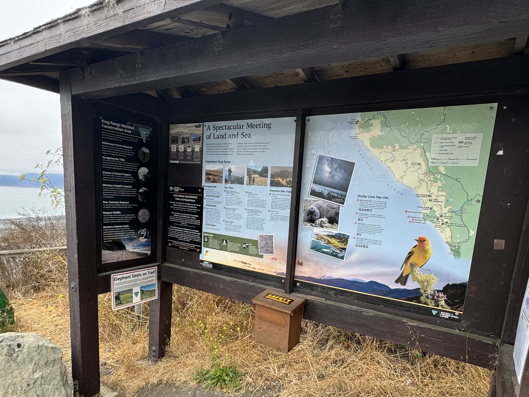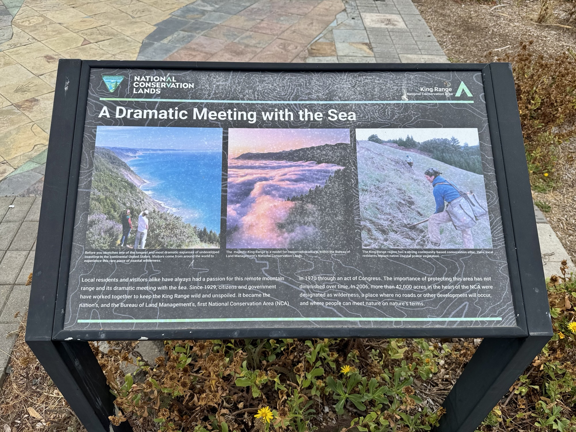 At the parking lot, there’s a beautiful overlook and view of the black beach below. I know I’m getting older because I seriously enjoy these interpretive signs. This one talks about local residents’ efforts to protect the Kings Range since 1929, and then this area became the United States’s first-ever National Conservation Area in 1970.