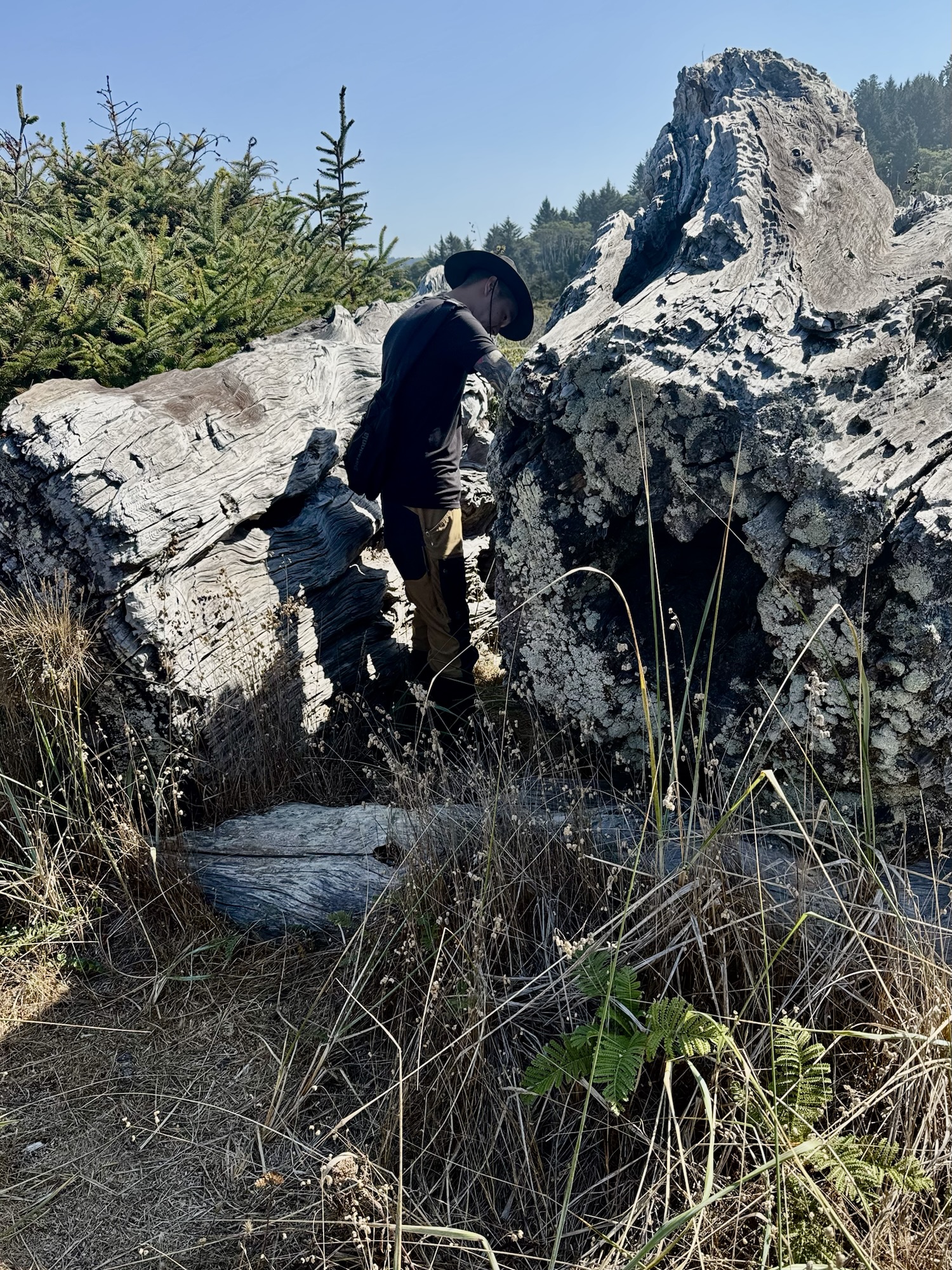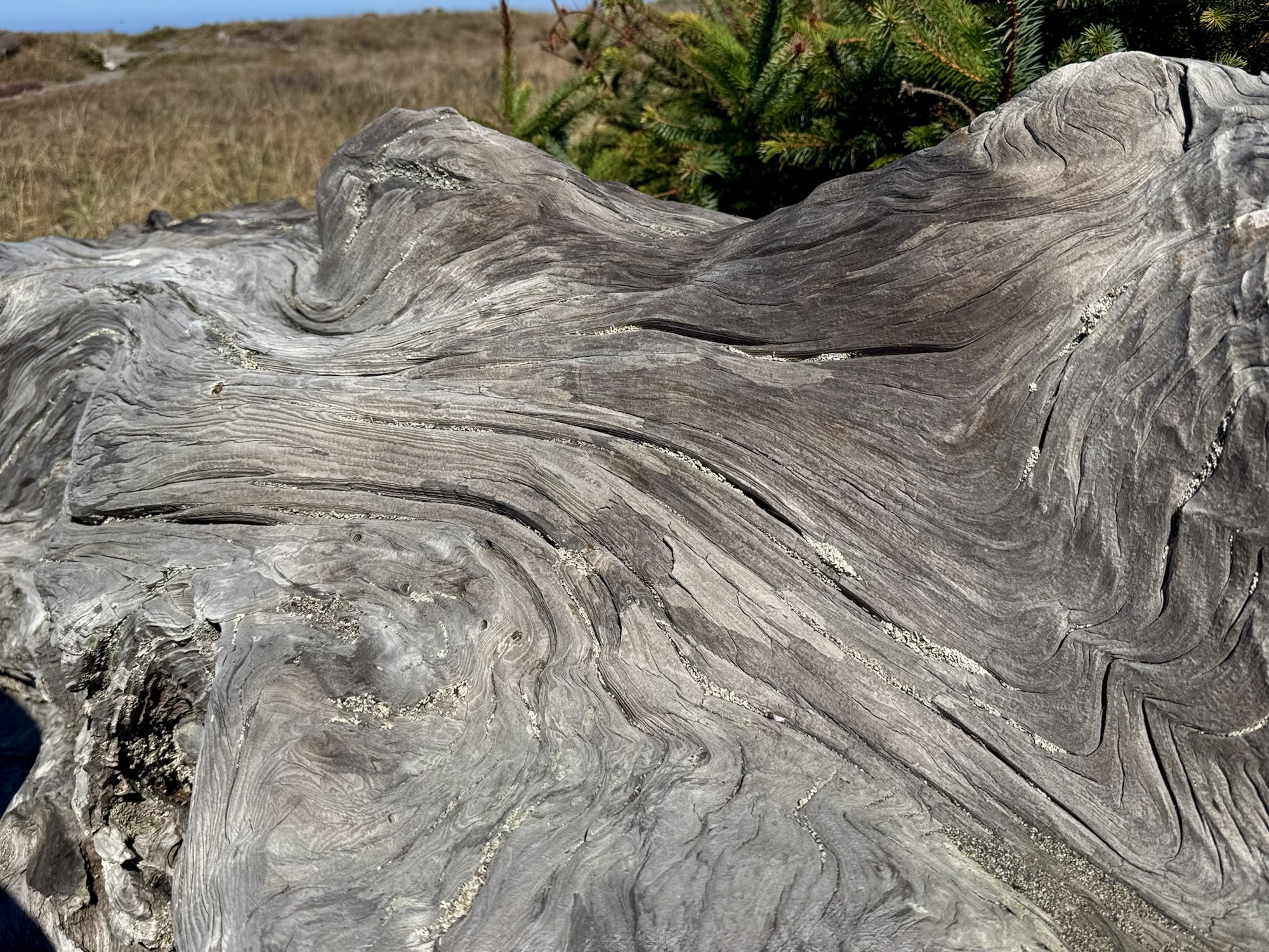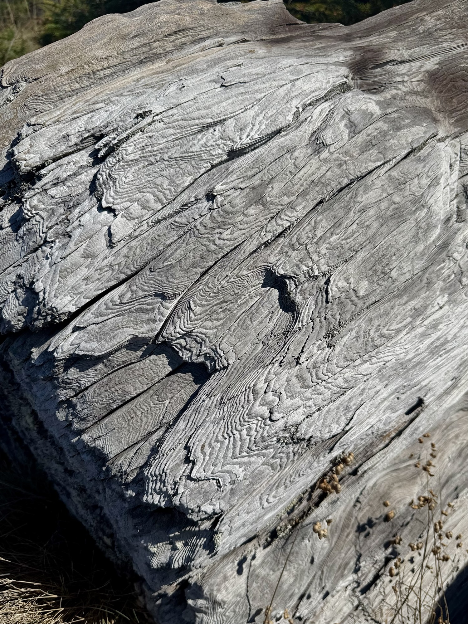 In the field adjacent to the beach at the Redwood Creek Picnic Area, there’s this giant, ancient, log with a geocache hidden in one of it’s crevices. The patterns in the bark were so interesting to me.