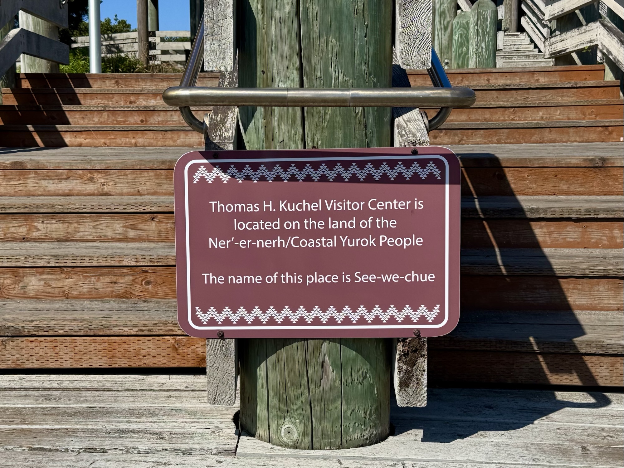 Thomas H. Kuchel Visitor Center is located on the land of the Ner’-er-nerh/Coastal Yurok People. The name of this place is See-we-chue.