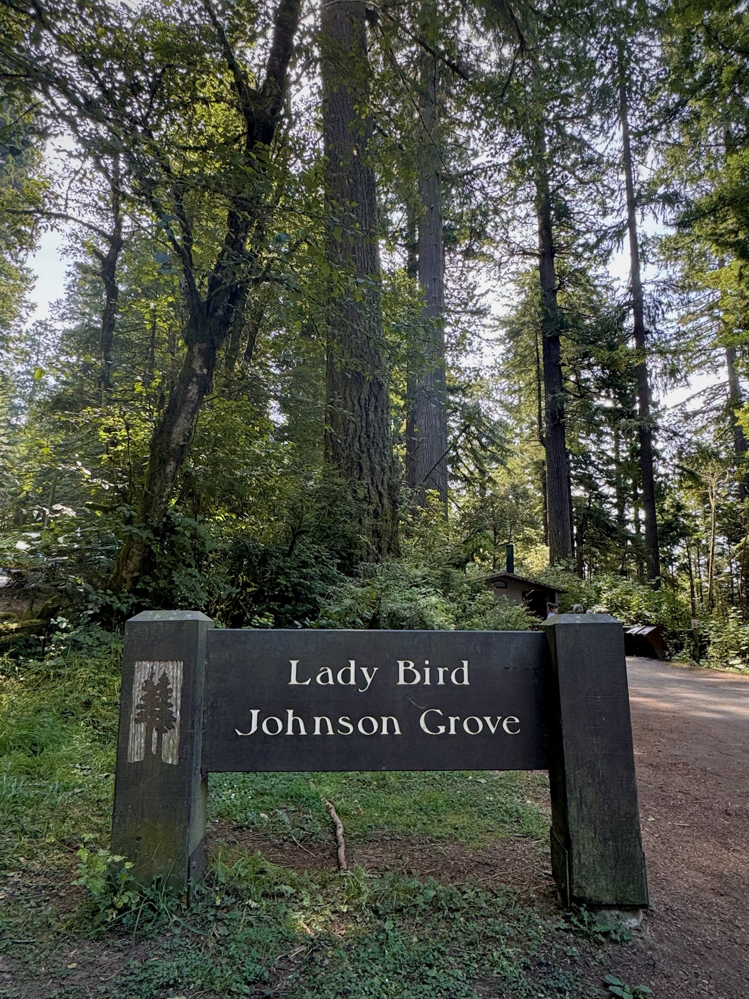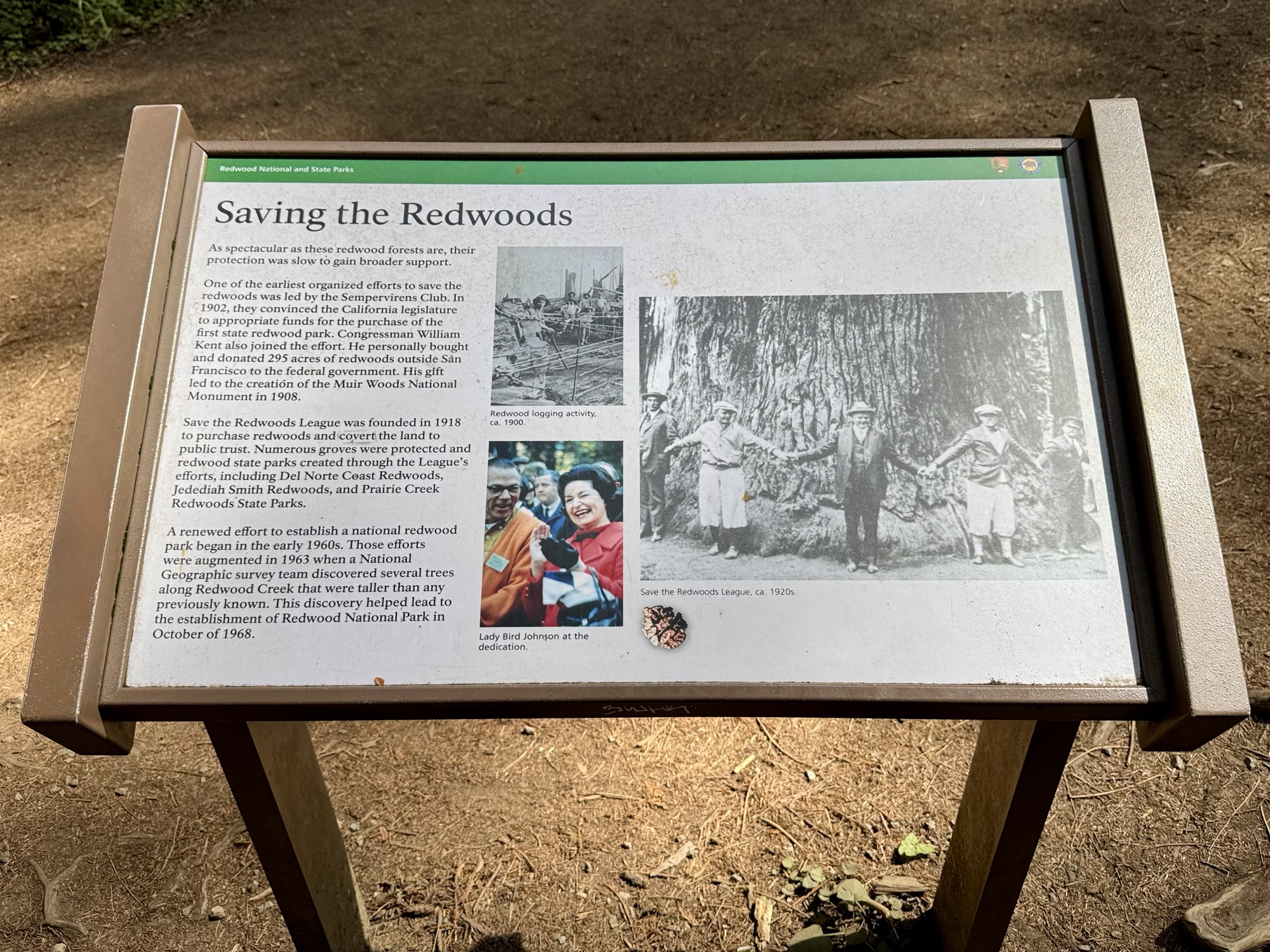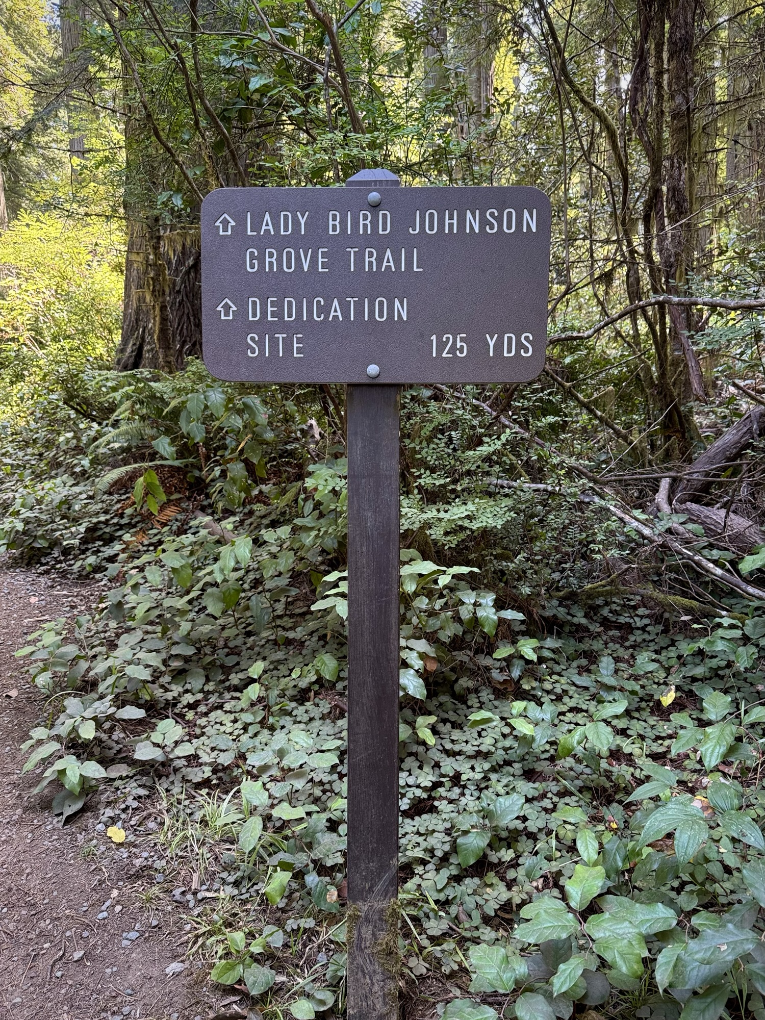 “Lady Bird Johnson came ot this site on November 25, 1968 to help dedicate Redwood National Park. She returned on August 27, 1969 to be honored by President Richard Nixon with this grove of trees named in her honor, recognizing Lady Bird’s devoted service to the cause of preserving and enhancing American’s natural beauty for the enjoyment of all people.“