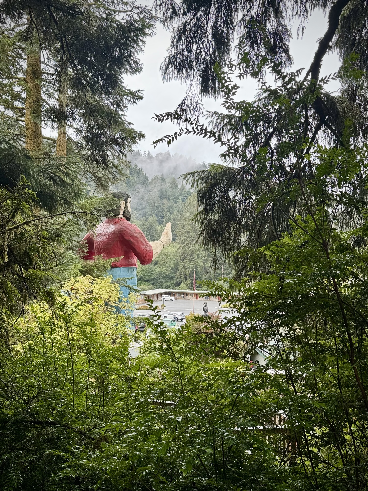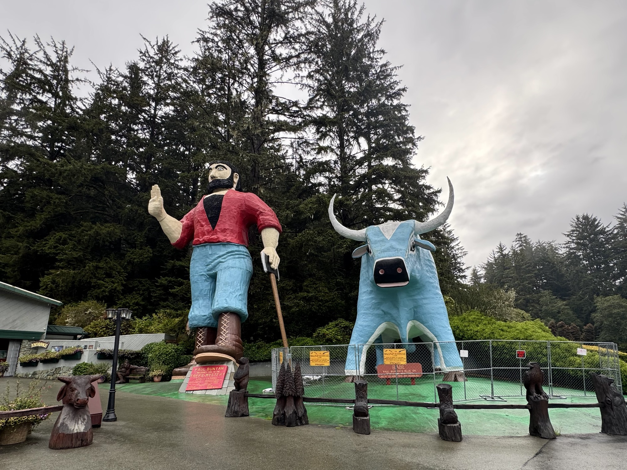 The parking lot is guarded by this gigantic Paul Bunyan and Babe.