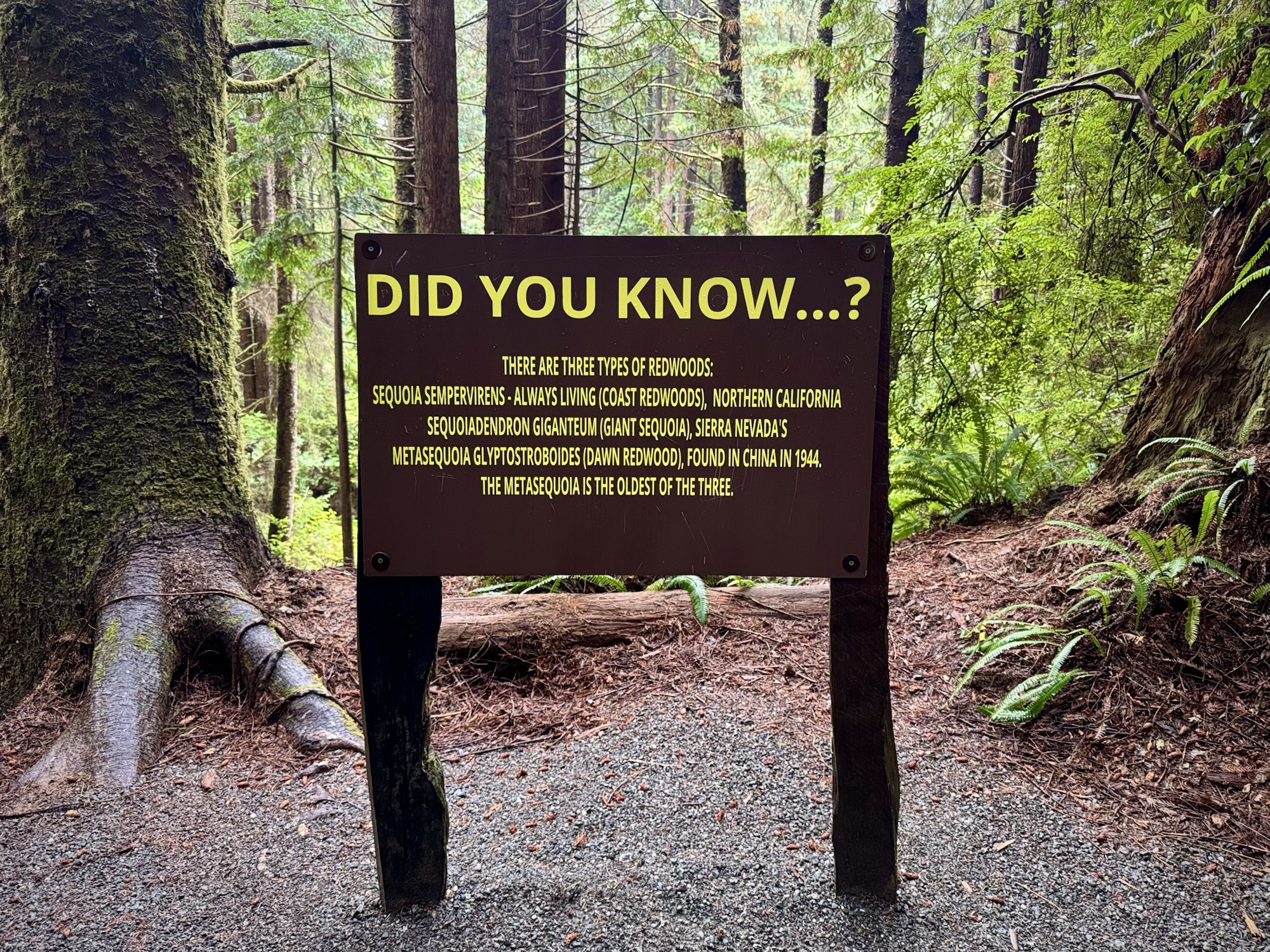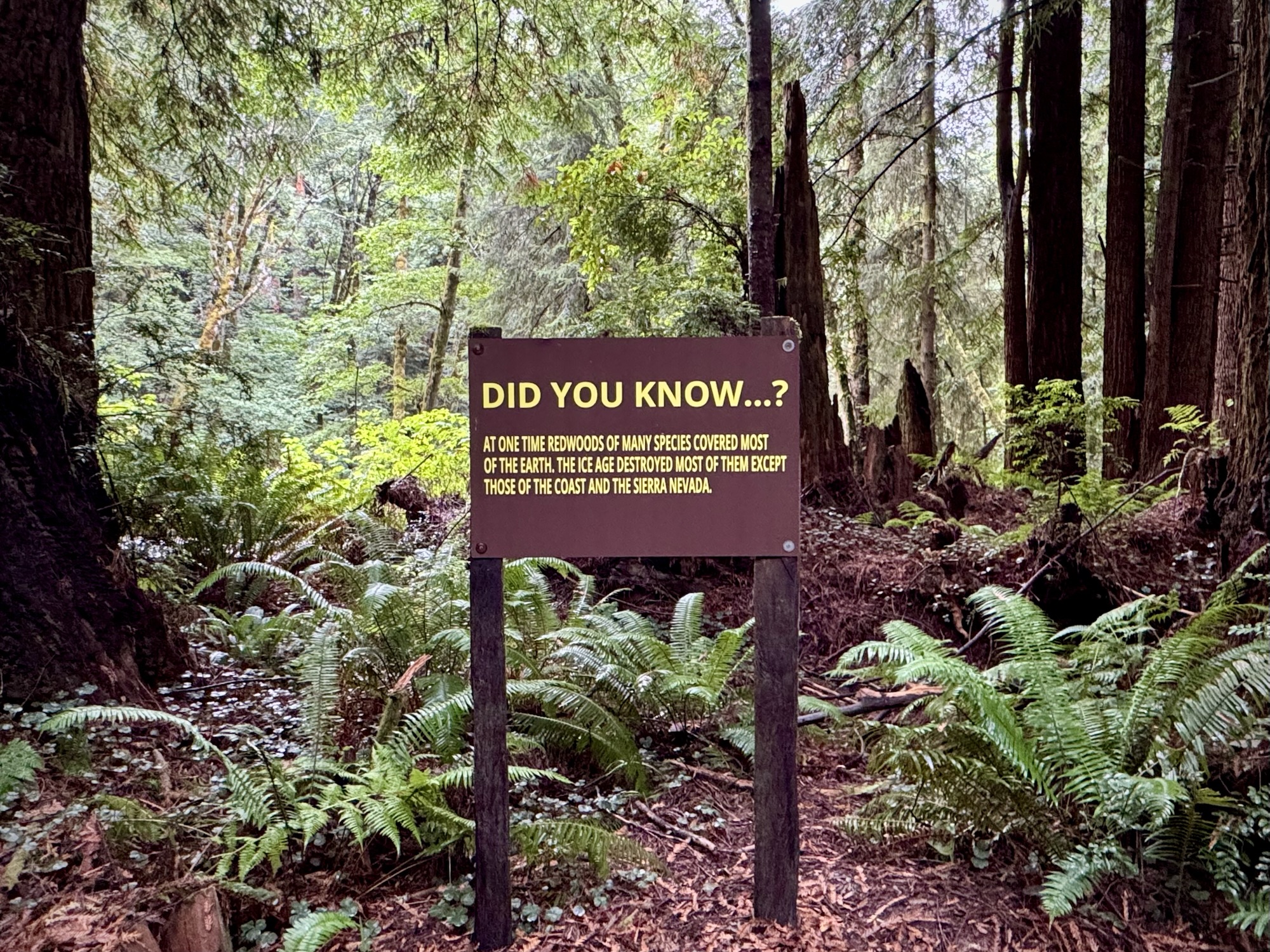 “Did you know? At one time, redwoods of many species covered most of the Earth. The Ice Age destroyed most of them except those of the Coast and the Sierra Nevada.”