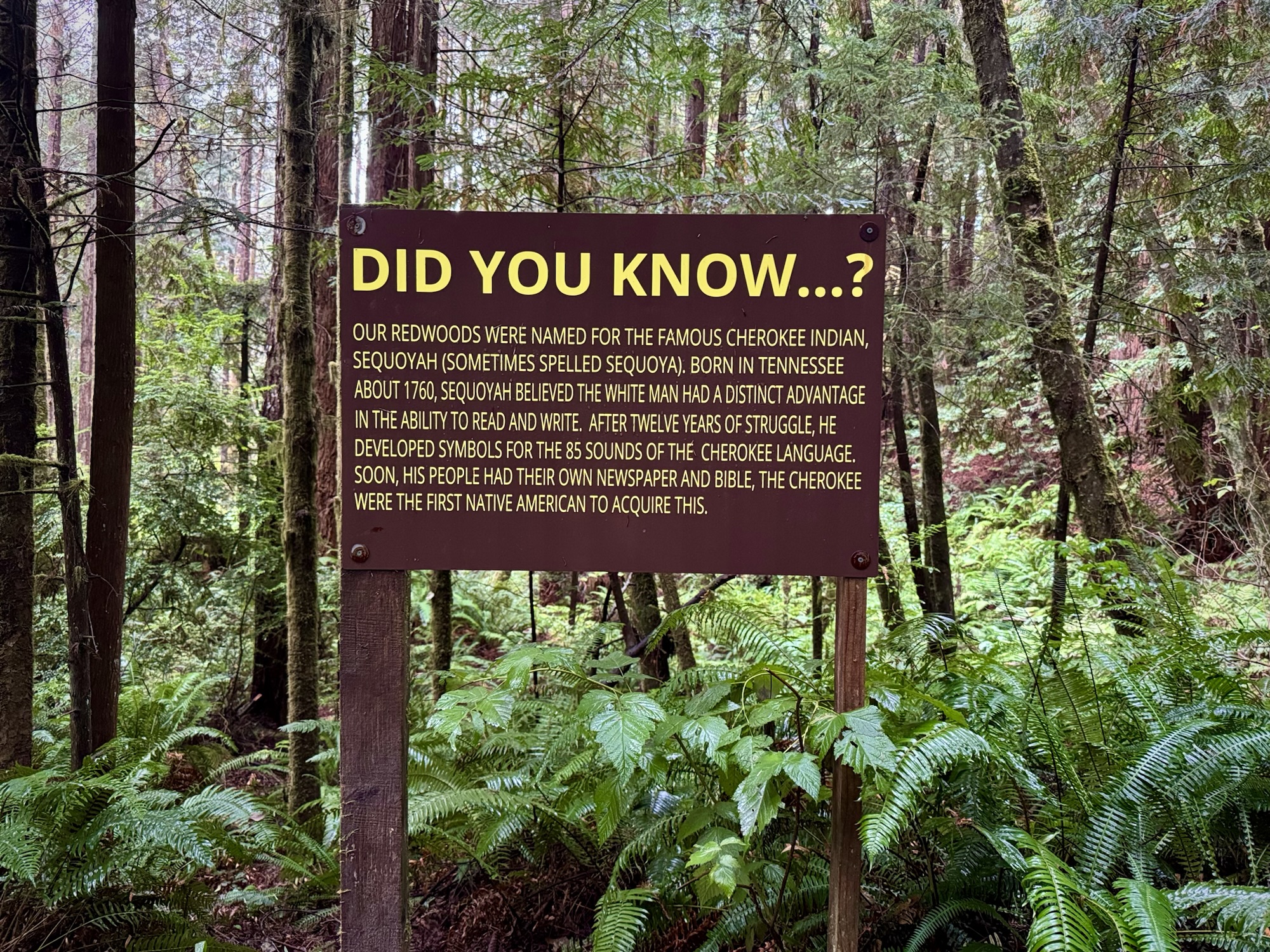 “Did you know? Our redwoods were named for the famous Cherokee Indian, Sequoyah…” who was born in Tennessee around 1760, who observed the Europeans’ written language and became motivated to create the same for the Cherokee, so he developed 85 symbols for their spoken sounds.